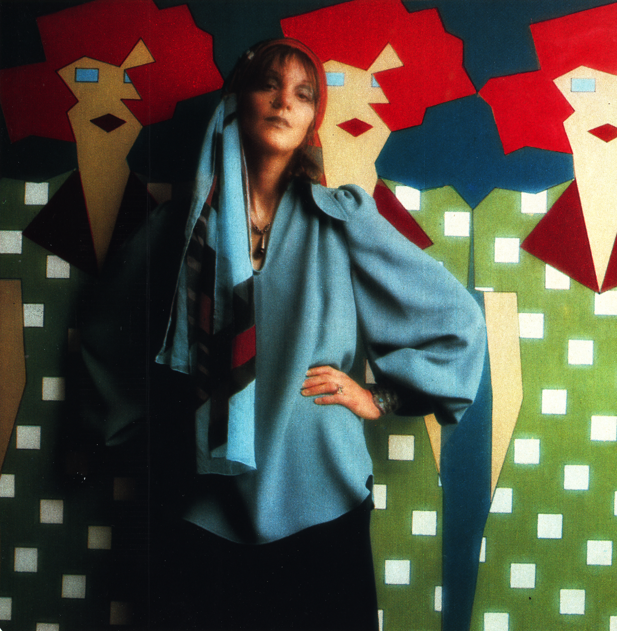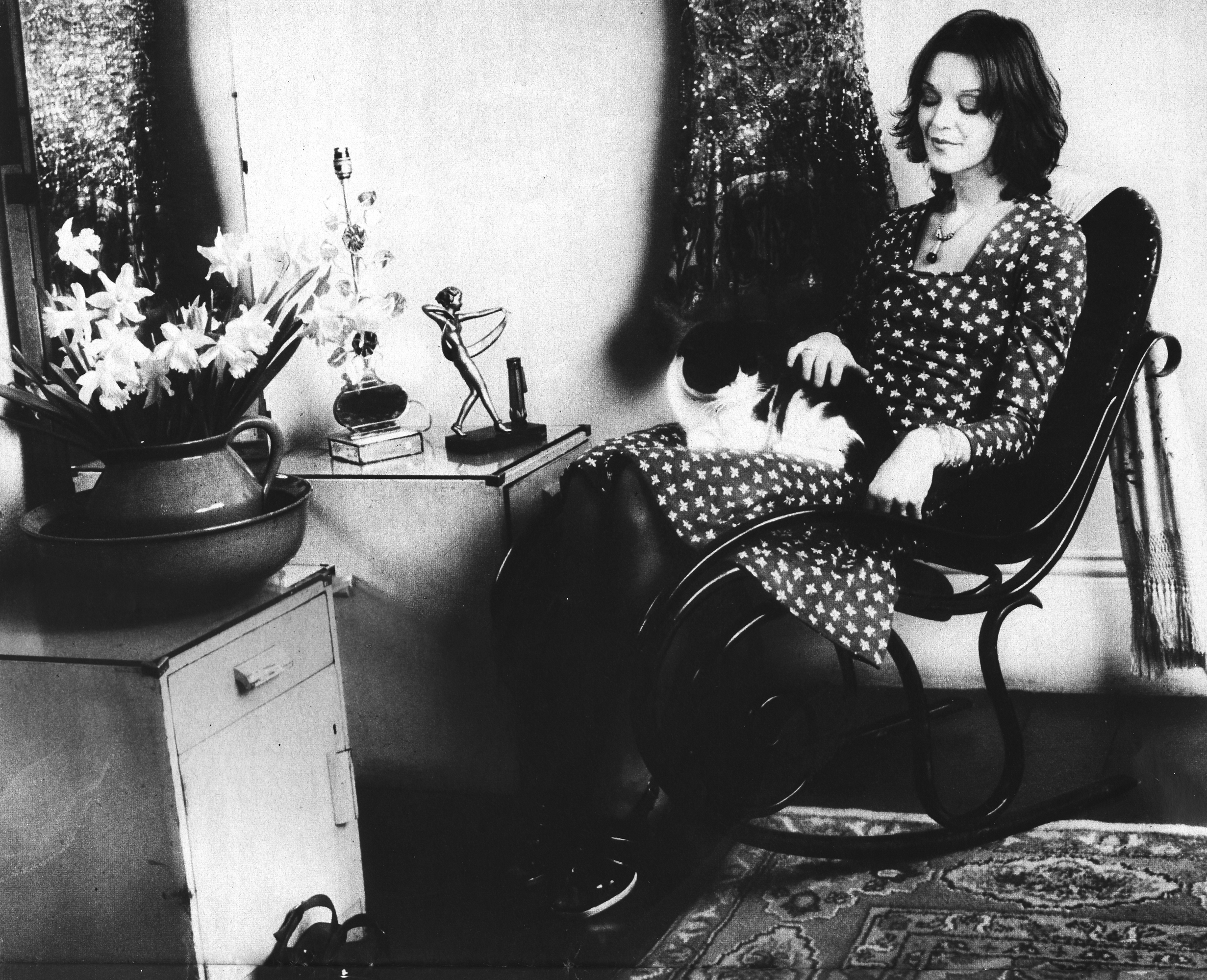 She lives in an enormous flat with her three children, a cat and a canary. At the moment she is in the throes of redecoration. One room she has already painted bright green – it is sparsely furnished with simple, modern furniture and some good paintings on the walls. The shelves are crammed with objects she has picked up in junk shops – glass cylinders filled with dried flowers, Art Nouveau statues and books.