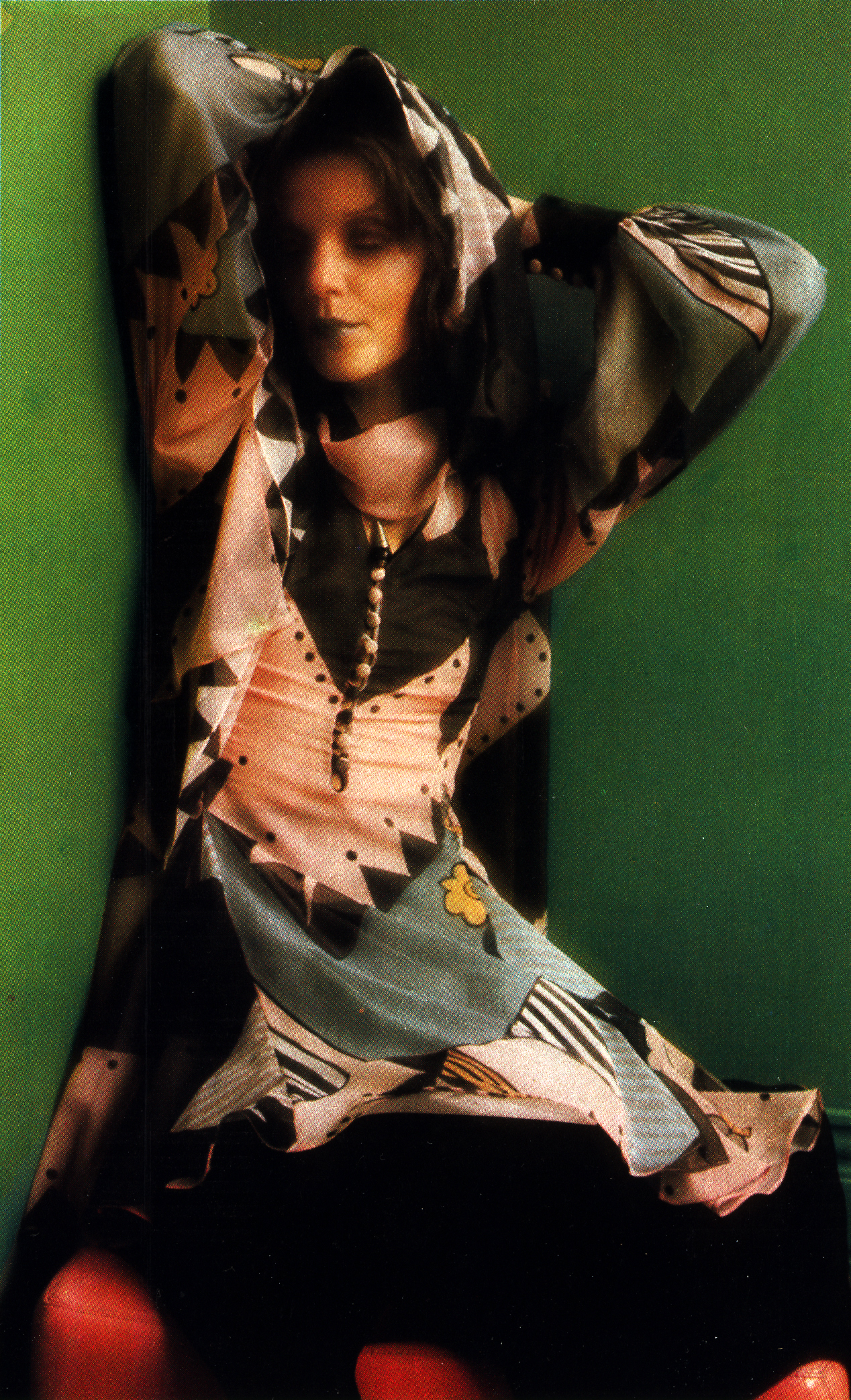 Alice Pollock is a dreamy sort of girl – incredibly thin with large, sullen eyes and wispy hair. Emancipated yet feminine she is the other half of the Quorum design team. She and Ossie Clark design beautiful clothes for their shop in the King’s Road and also produce a special budget range for Radley which is sold all over the country.