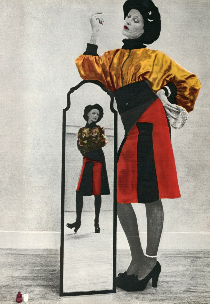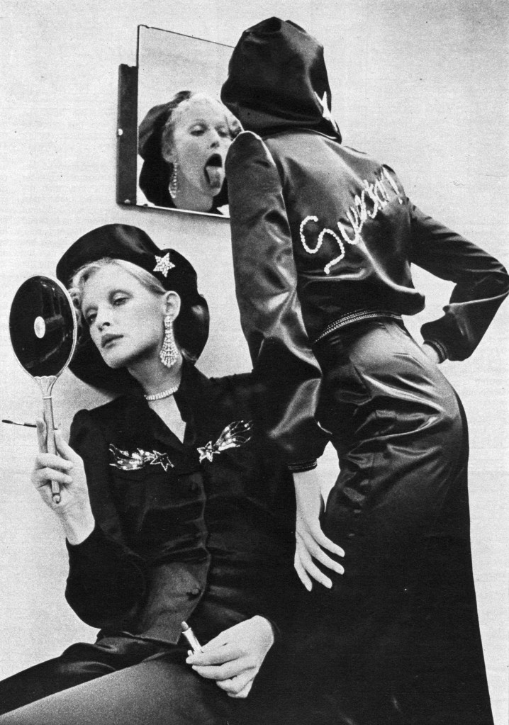 Black satin beret, by Titfers, £8.50. Black satin blouse with shooting stars embroidered in beads, £6.95; half-mast trousers, £4.95, both by Lee Bender at Bus Stop. Diamante star brooch on beret, by Paul Stephens, 75p. Dangly fake diamond earring from a selection at Marie Middleton, Chelsea Antique Market. Fake diamond necklace from a selection at the Purple Shop, Antiquarius. Black satin beret with rhinestone stars, by Titfers, £8-50. Black satin ‘Superstar’ zipper jacket and trousers, by Angela At London Town, £17. Dangly fake diamond earring, from a selection at Marie Middleton, Chelsea Antique Market. Art Deco wall mirror, £6 and black and silver hand mirror, from a selection at Antiquarius. Lipstick and make-up by Biba.