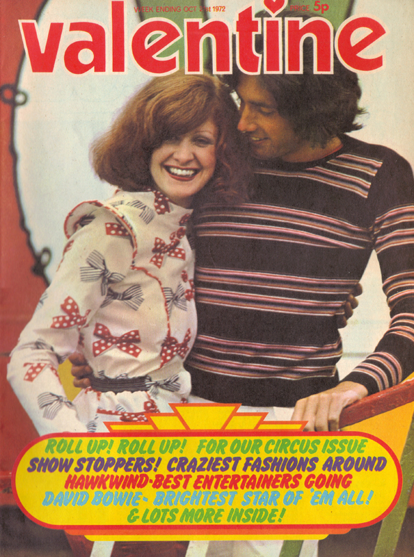 Not really Valentine themed (unless you’re planning to spend your day at the circus, which would actually be a pretty good way to spend it…) but scanned from teeny girl magazine Valentine which is largely filled with comic strip stories aimed at hormonal young ladies. I bought it mainly because I recognised the garment on the front cover as a Miss Mouse/Rae Spencer Cullen with distinctive bow print. I’m also a sucker for the circus theme, which seems to be a recurring favourite for late Sixties/early Seventies fashion stylists…