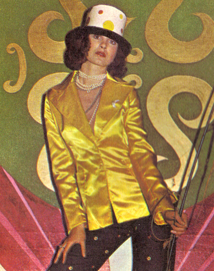 Flamboyant concertina-pleated Courtelle wrapover blouse with elasticated frilled waist £4, and skin-tight Lurex toreador pants £5 50, both by Martha Hill, 39 Marylebone High Street, W1, mail order 25p extra. Waist-cinching leather belt £4.70 and diamante bracelet £2 both from Biba , sheer seamed tights, Mary Quant 75p, diamante-studded snakeskin shoes, Leicester Shoes £13.99; egg-shaped choker, Baggage & General £1 50; plastic bobble earrings, 43p, carved plastic bangle 40p, both by Adrien Mann chiffon scarf 15p from Woolworths