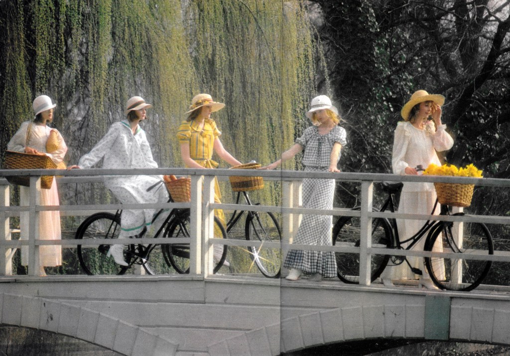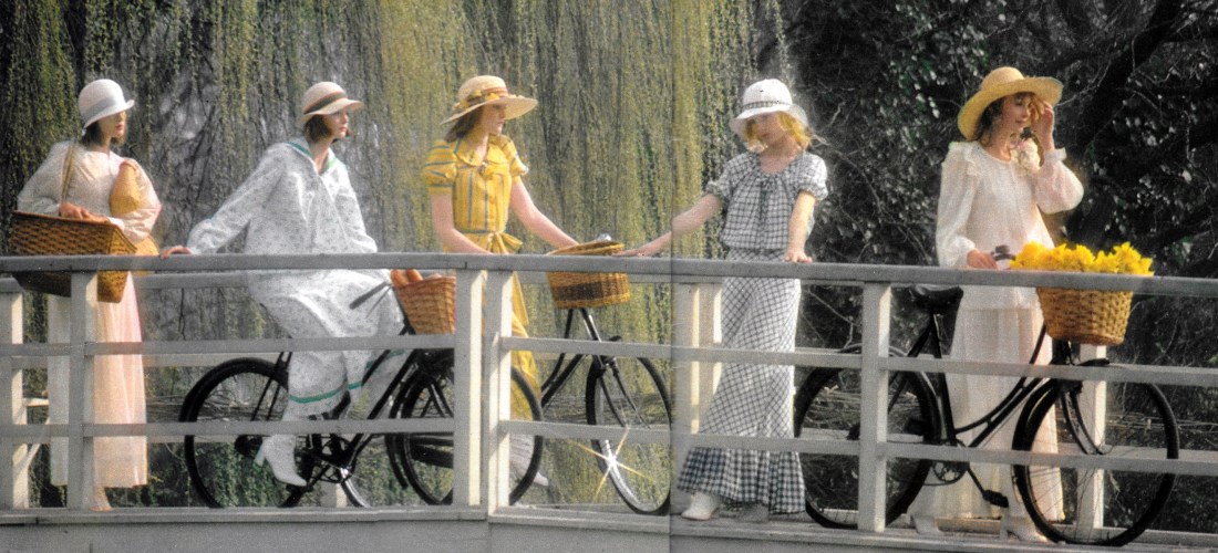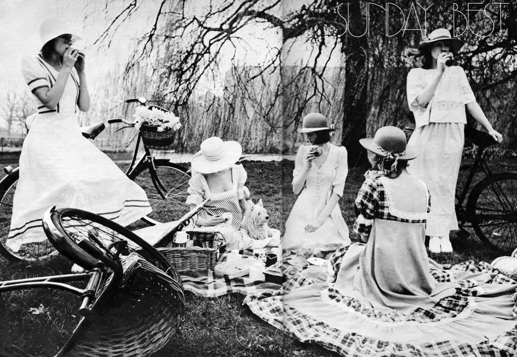 White felt cloche hat by Bermona hats. Pale cream floral waisted shirt by Stirling Cooper. Long white cheesecloth skirt by Alkasura. White lace up boots by Anello and Davide. / Straw panama hat by Bus Stop. Pale green and dark green print sailor suit by Laura Ashley. Boots by Anello and Davide. / Chipped straw hat by Edward Mann. Yellow dress with stripes by Spectrum. White boots from Bilbo. / White hat with ribbon by Spectrum. Blue and white gingham shirt and skirt by Spectrum. White boots by Anello and Davide. / Peanut straw hat from Edward Mann. White cheesecloth shirt and skirt by Spectrum. Boots by Anello and Davide.