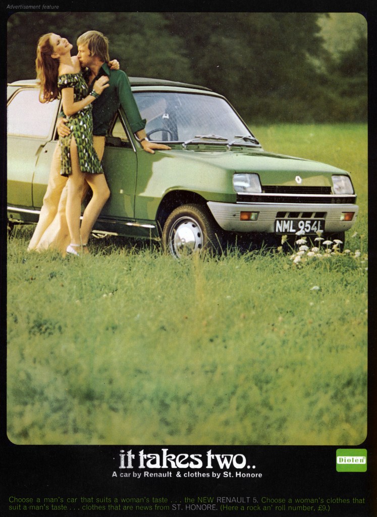 Choose a man’s car that suits a woman’s taste … the NEW RENAULT 5. Choose a woman’s clothes that suit a man’s taste … clothes that are news from ST. HONORE. (Here a rock an’ roll number, £9.)