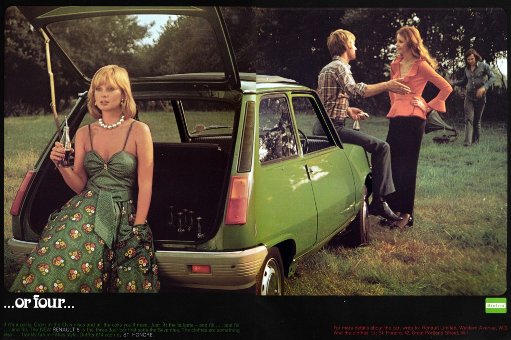 …or four… if it’s a party. Cram in the Elvis discs and all the coke you’ll need. Just lift the tailgate – and fill … and fill … and fill. The NEW RENAULT 5 is the three-door car that suits the Seventies. The clothes are something else … frankly fun in Fifties style. Outfits £14 each by ST. HONORE.