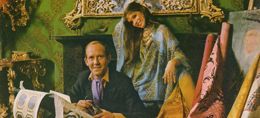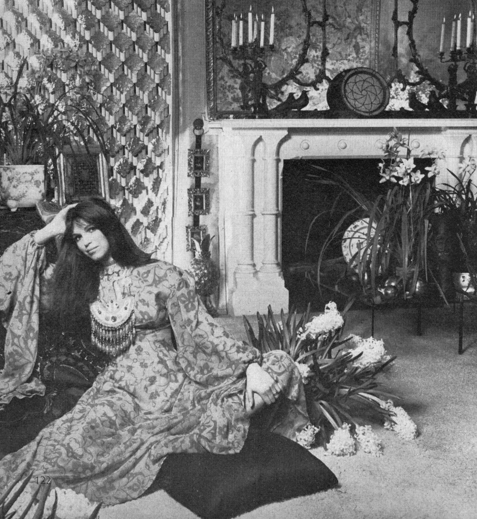 Michael Szell is the Hungarian fabric designer who is introducing Iran to London via a new collection of designs, taken up by Thea Porter for her romantic and ravishing evening dresses. His own bedroom, opposite, is in rich emerald, turquoise and brown arabesqued linen, cool and grand by day but rich and warm by electric light, with 18th-century Eng-lish paintings and mirrors. His drawing-room, below, is turquoise with brilliant Persian prayer mats colouring the walls, 18th-century English botanical china, and a mixed forest of hyacinth and growing orchids, later bluebells and orchids. Iran runs through Michael Szell’s life like a thread. He began to visit friends and connections there while he was still a child, used every possible holiday to get there while he studied economics at Aberystwyth University, and later when he worked with Sir Nicholas Sekers. His love for Persian ceramics, buildings and woven carpets developed into a passion for early Islamic art in its formal, random, asymmetric period before it came to represent life in the 19th-century : a passion culminating in his opening his own furnishing fabric showrooms at 47 Sloane Avenue. He began selling silk signature scarves to Henri Bendel of New York in 1969 and has just produced his new Persian collection of fabrics. Thea Porter asked him to print his designs onto silk chiffon for her and made them in flowing evening dresses with yards of floating sleeve and skirt.