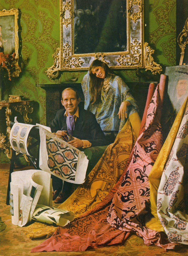 Michael Szell in the bedroom of his London flat. The rolls of fabric, his new collection of Persian prints for Thea Porter. The dress, simply one length from the range worn like a caftan.