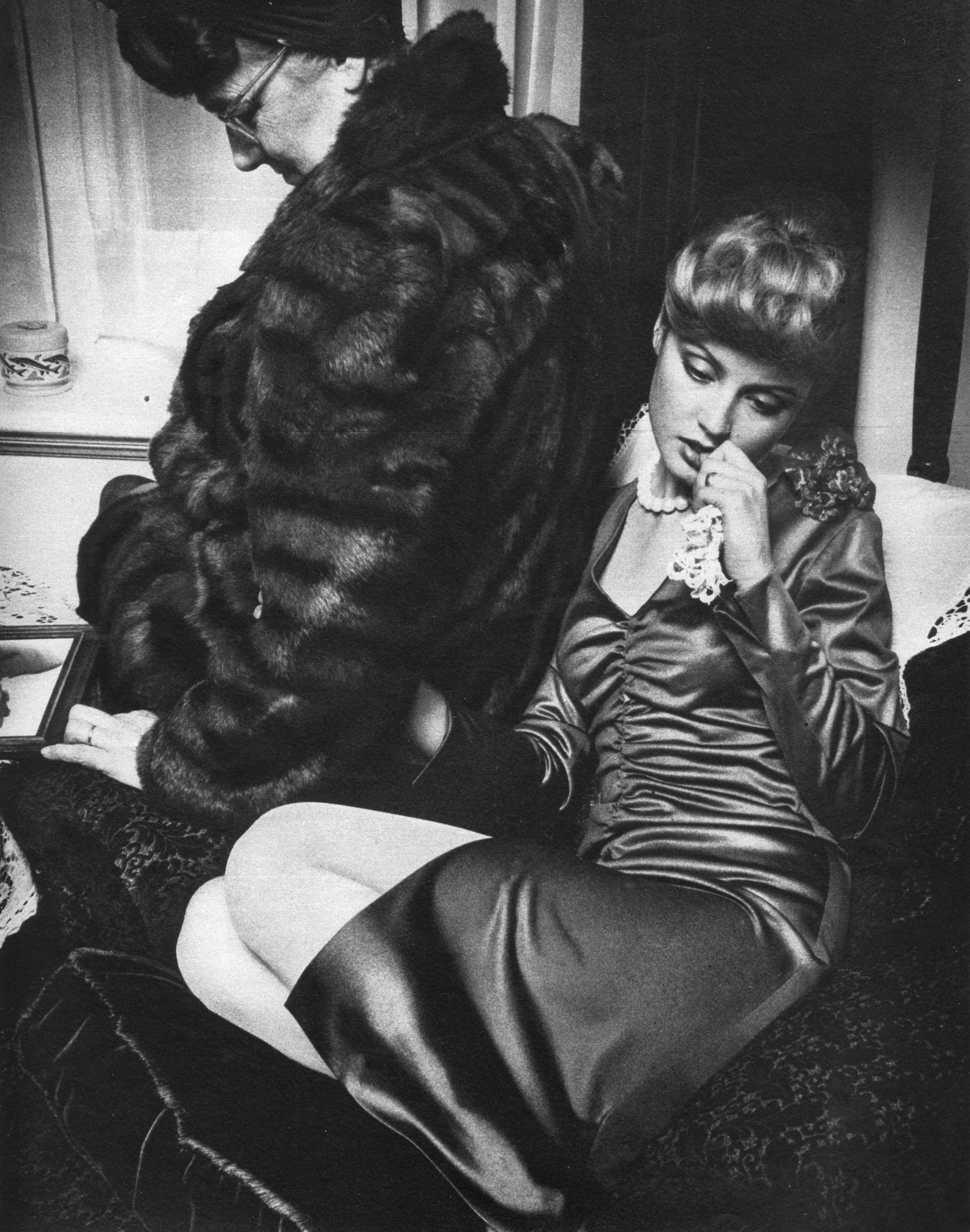 Caviar and Champagne dresses: Hats from J. C. Brosseau from Feathers. Veiling from Biba. Dresses by Tony Berkeley. Beige shoes found by our model in a junk shop.