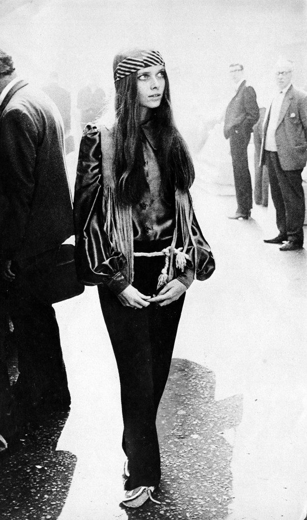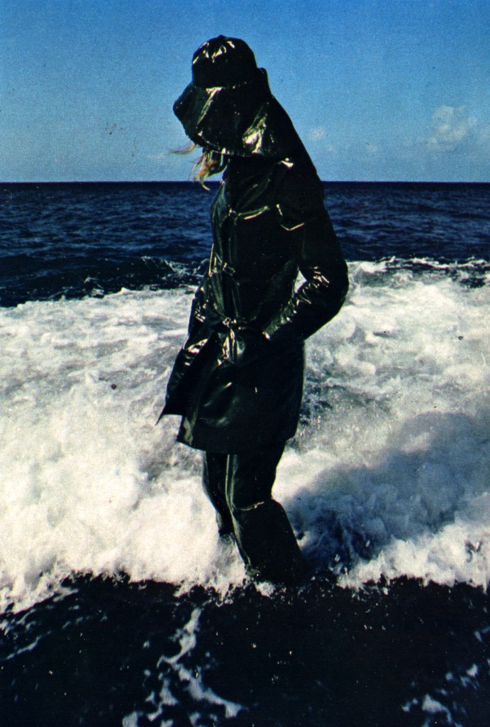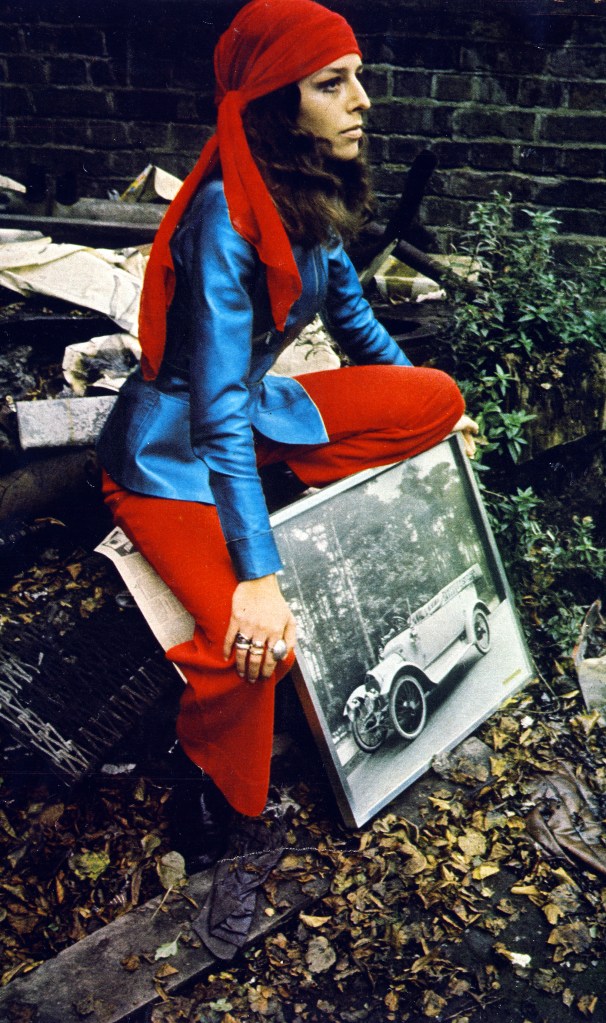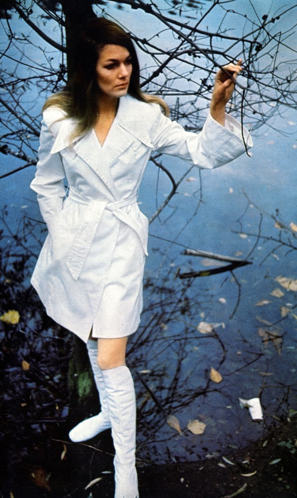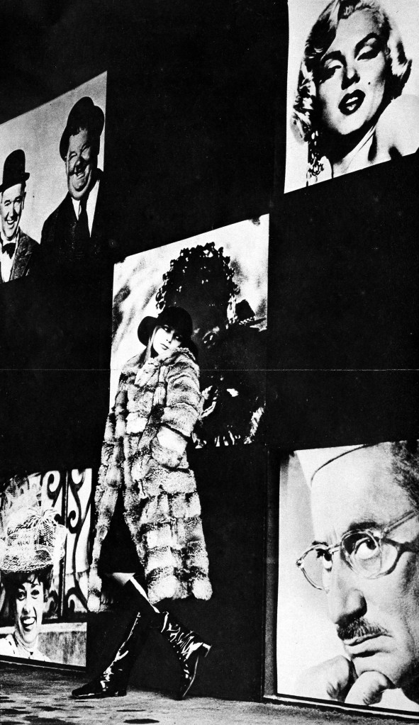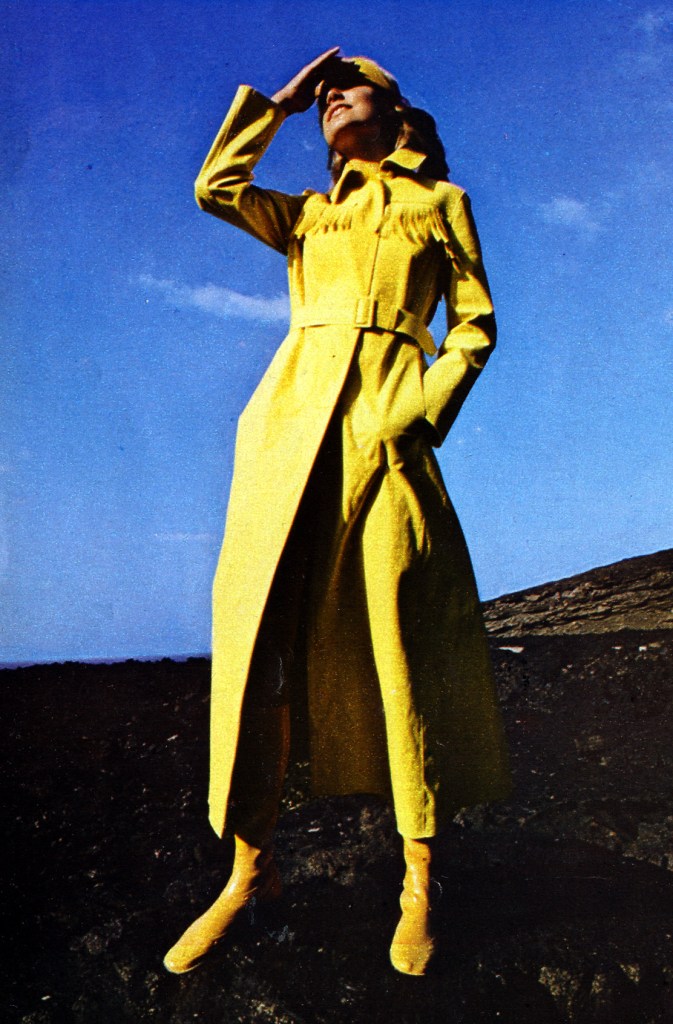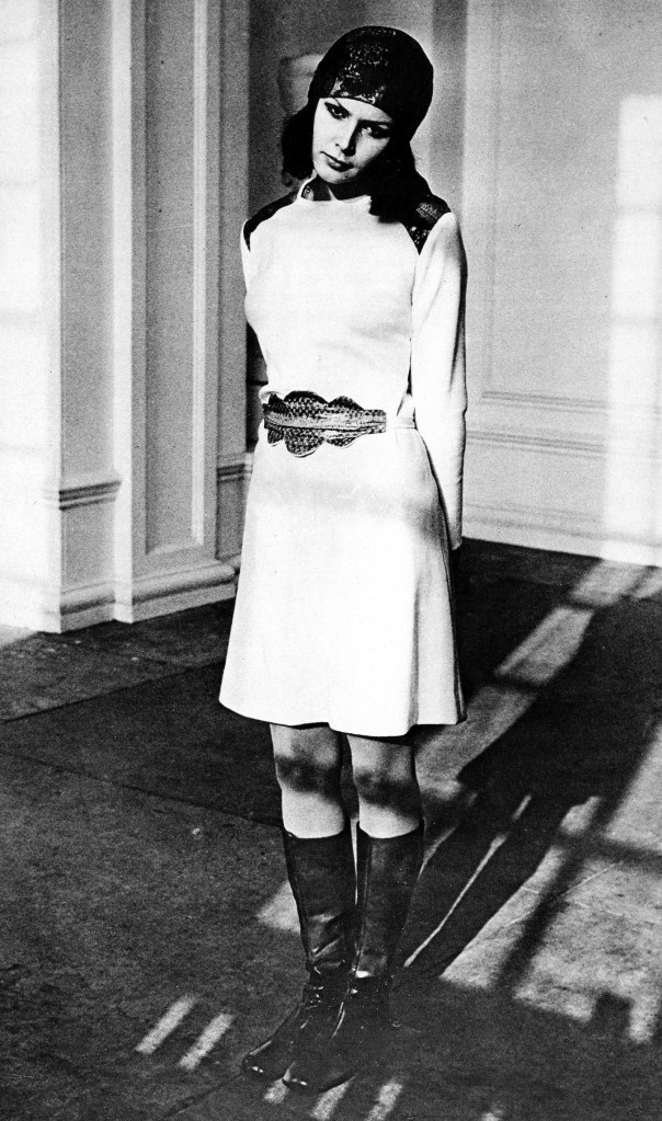 RIGHT: Shocking pink angora goatskin jacket, Ambalu, £25 from Ambalu, Kensington High Street, W8. Fruity framed bamboo sunglasses, Coopers £6, pink and white bar shoes, Ravel £6.50: shocking pink tights, Mary Quant 40p; white ribbed polo-neck sweater, McCaul, £2.80.