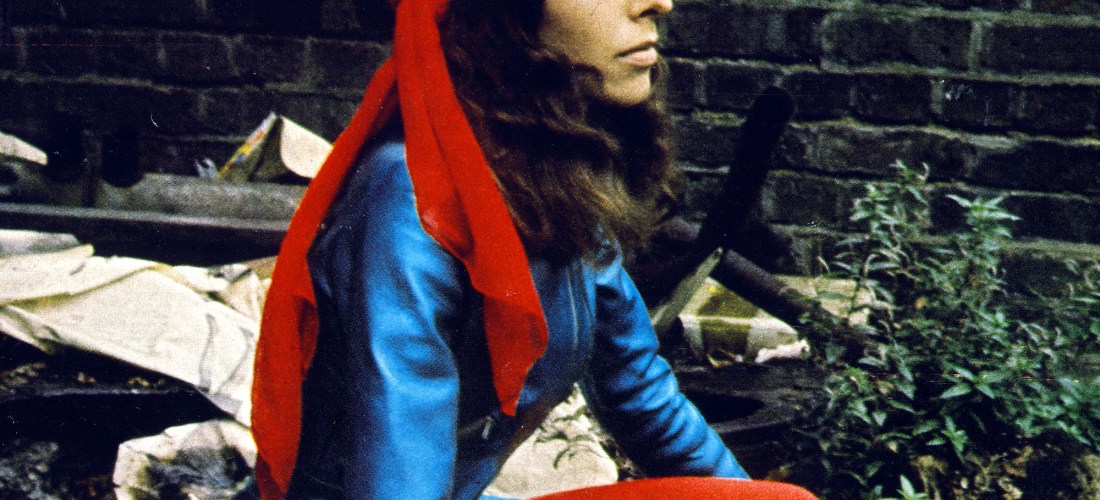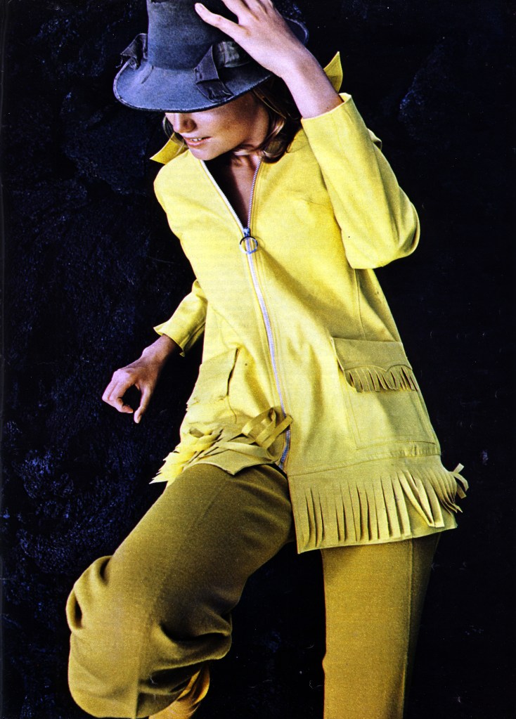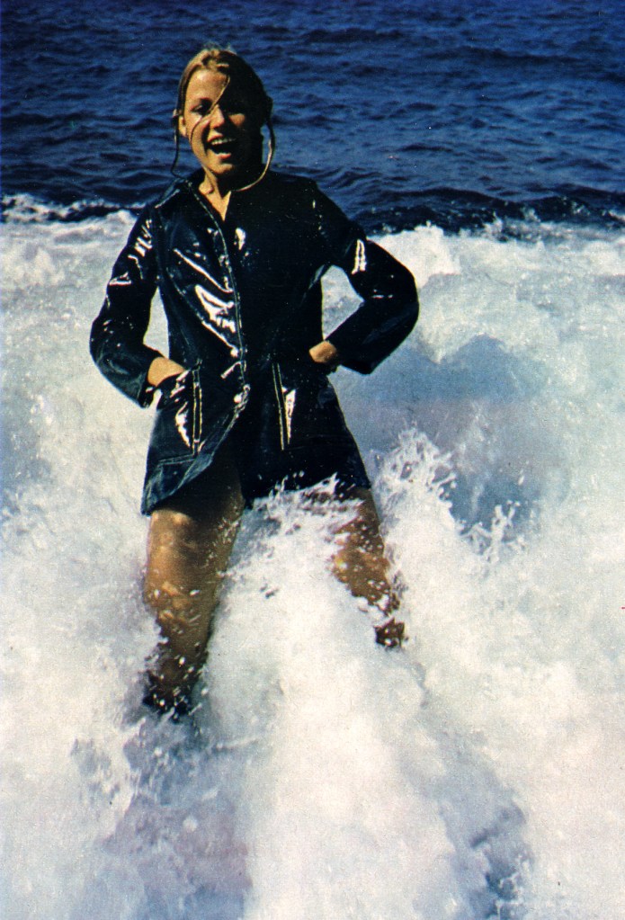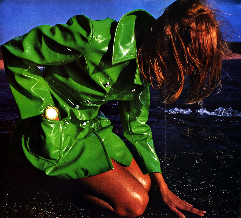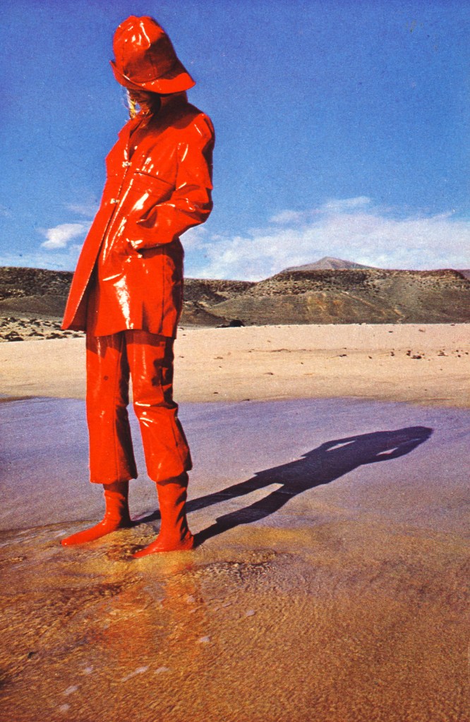 RIGHT: Scarlet spikey fur bomber jacket. Weathergay £10.95. Striped cotton T-shirt from Biba 95p; red and yellow striped patent belt, Gay Designs 69p; chrome yellow cable-knit socks, Morley 39p; strappy wedge-heel shoes, Leicester £6.99; lemon ribbed gloves, Dents 70p.