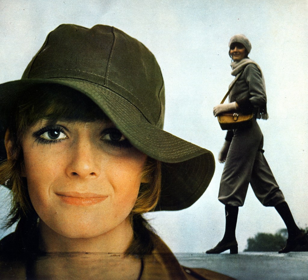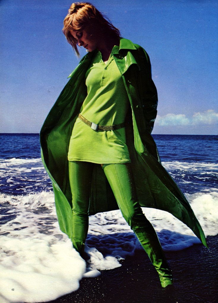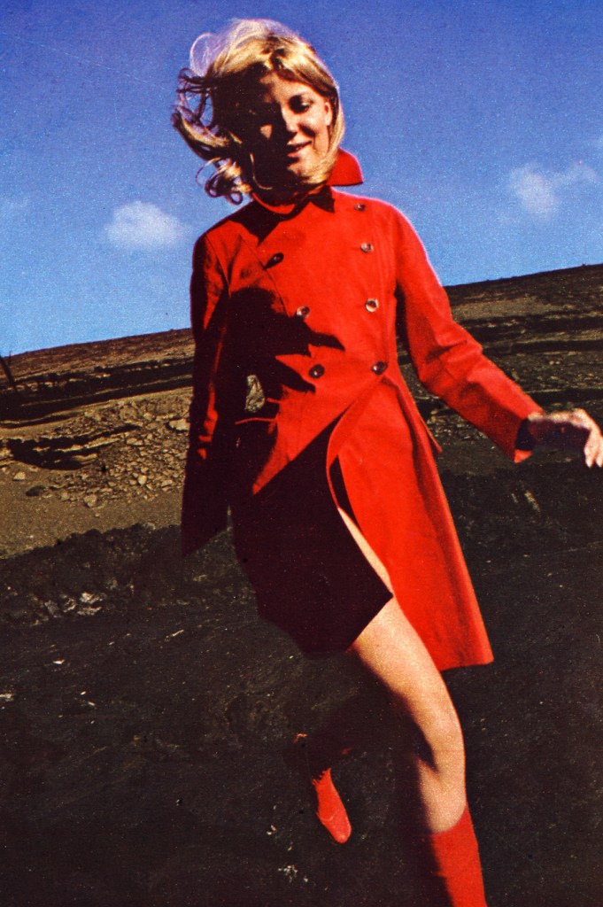 RIGHT: Emerald shaggy battledress jacket with corduroy trim. Weathergay £9.50. Red and green striped sweater, Erica Budd £3-55; green tights. Mary Quant 40p; wedge-heel shoes, Leicester £6.99; red wool gloves, Dents 75p.