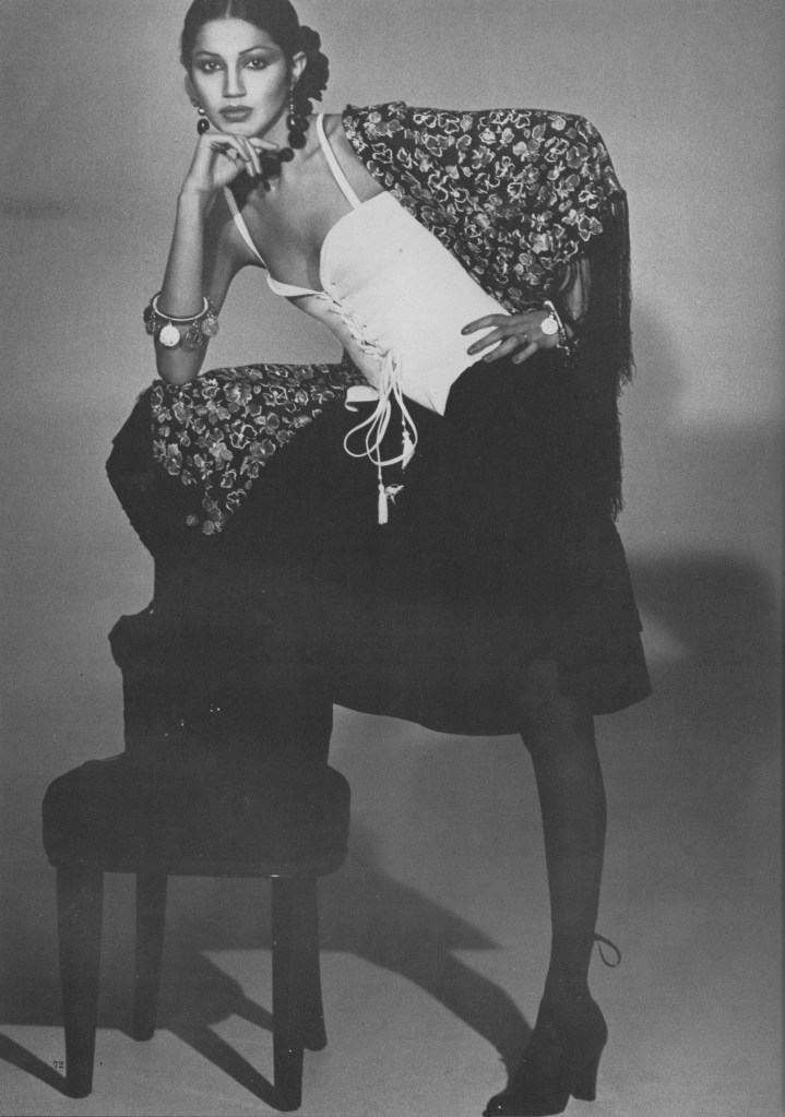 Corselette in white cotton about £60 ; short full skirt in black cotton, about £107 ; shawl with brilliant flower print on black, about £100. Black patent pumps with satin lacing, about £45. All by Yves Saint Laurent from Saint Laurent Rive Gauche shops at Brompton Rd, SW3 ; New Bond St,W1 and Intercontinental Hotel, Hyde Park,W1. All jewellery by Saint Laurent.