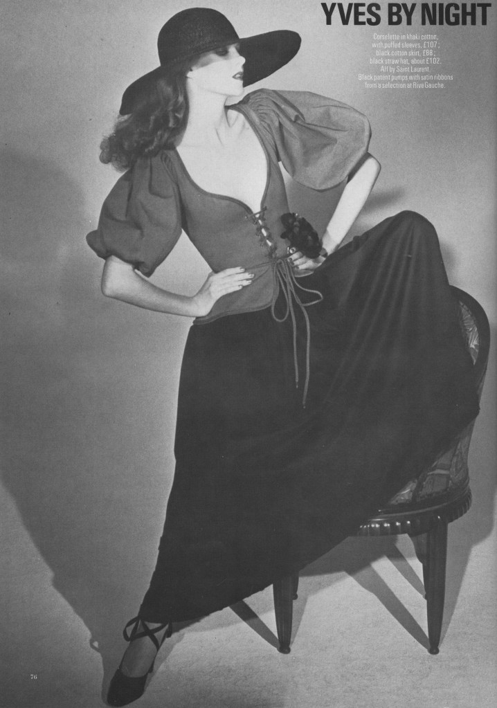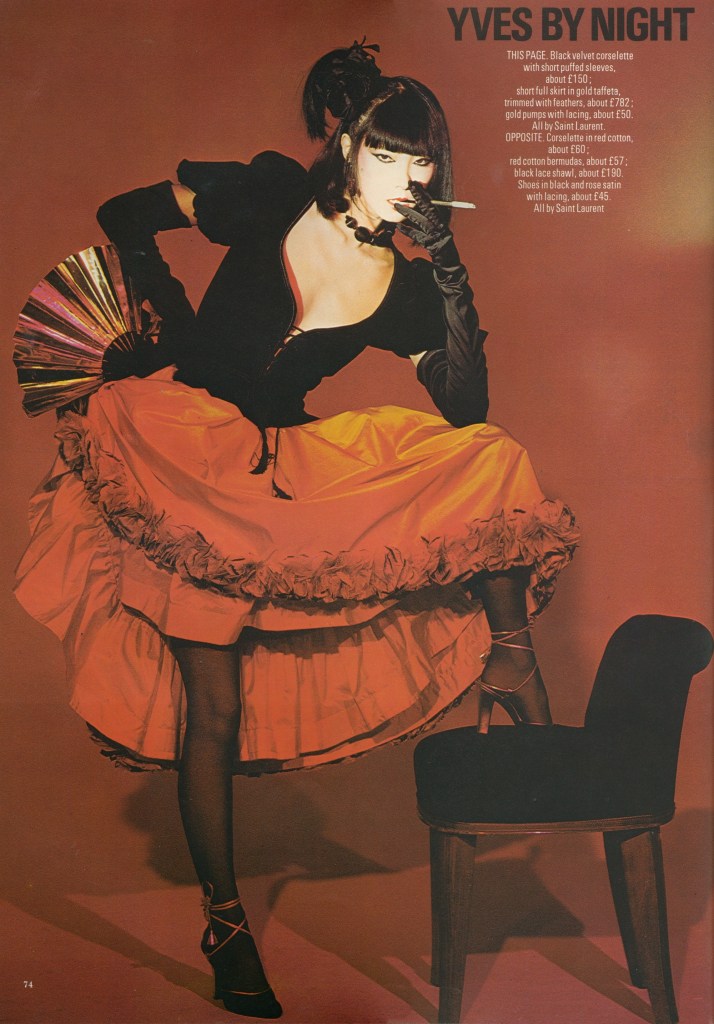 Saint Laurent’s latest evening clothes kick their way straight out of the Moulin Rouge. These are the sexiest clothes ever: tightly-laced bodices on tiny straps, in plain colours, huge billowing, bouffant skirts in brilliant shades of crunchy taffeta or brightly-dyed cotton. Notice the new skirt lengths, short and saucy to only just below the knee, or flamenco-length, a scant two inches above the ankle. Eminently copiable, this look —Janet Reger is already doing the La Goulue corselettes, and your dressmaker could run up a quick twelve yards of taffeta.