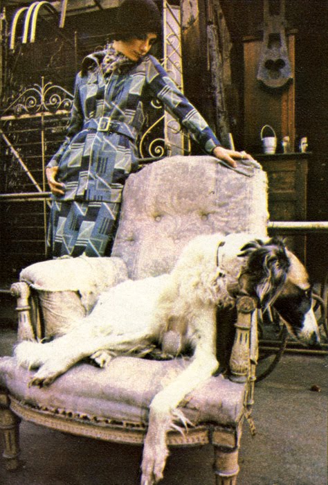 Patrick Procktor is contributing to the programme for Mr Fish’s ‘frock fantasy’. Ossie Clark’s sensational model, Gala, will wear some of the clothes, as she did for us in company with Barbara Trentham. Make-up here by Barbara Daly; hair by Smile; location, Mr Paul Hamlyn’s house.