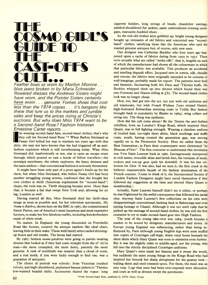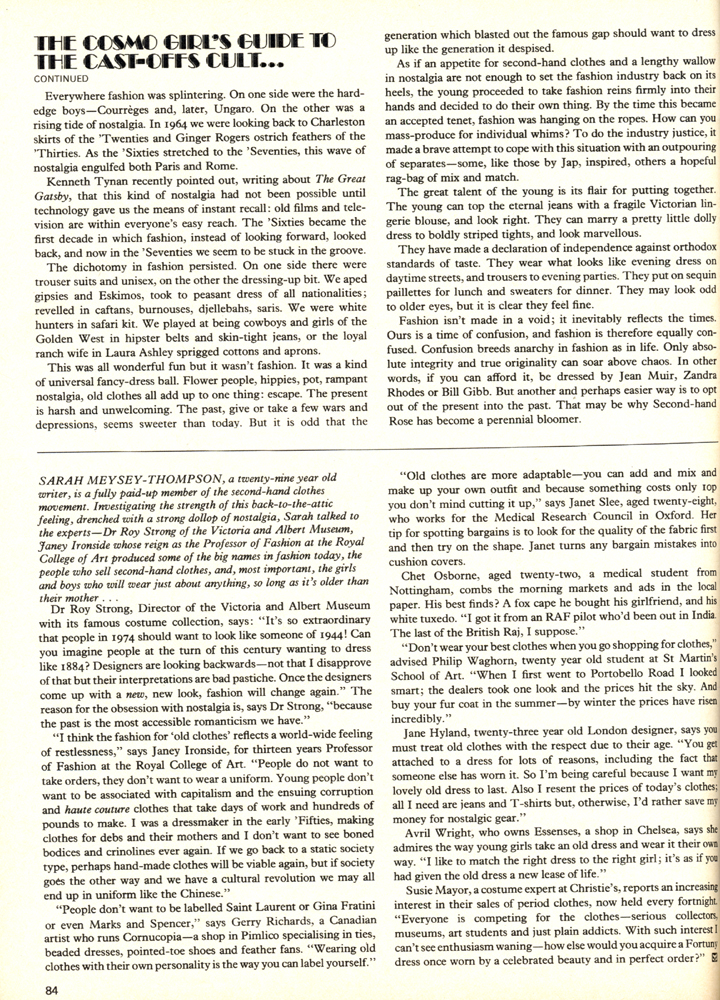 I respect people for adopting an unusual look, whether it be vintage or any other subculture, and I respect anyone who makes an effort with their hair. But I have never, and will never, understand the way vintage has turned into a kind of uniform. I know I personally approach it as a way of creating my own style without anyone else’s rules in my head, and also because I have a stupidly stubborn (and geeky) interest in certain eras other people consider ludicrous. But while I sit, engrossed in magazines, films, music of the time, I don’t ever feel like I need to copy any of it slavishly to justify my own vintage-ness. If that is even something I want to define myself by. It is about self-expression, but an unfortunate number of people are expressing their conformity in my opinion. The moment I see a cast member from Made in Chelsea wearing a floppy felt Seventies-style hat, is the moment I put my own original hat to the back of my wardrobe.