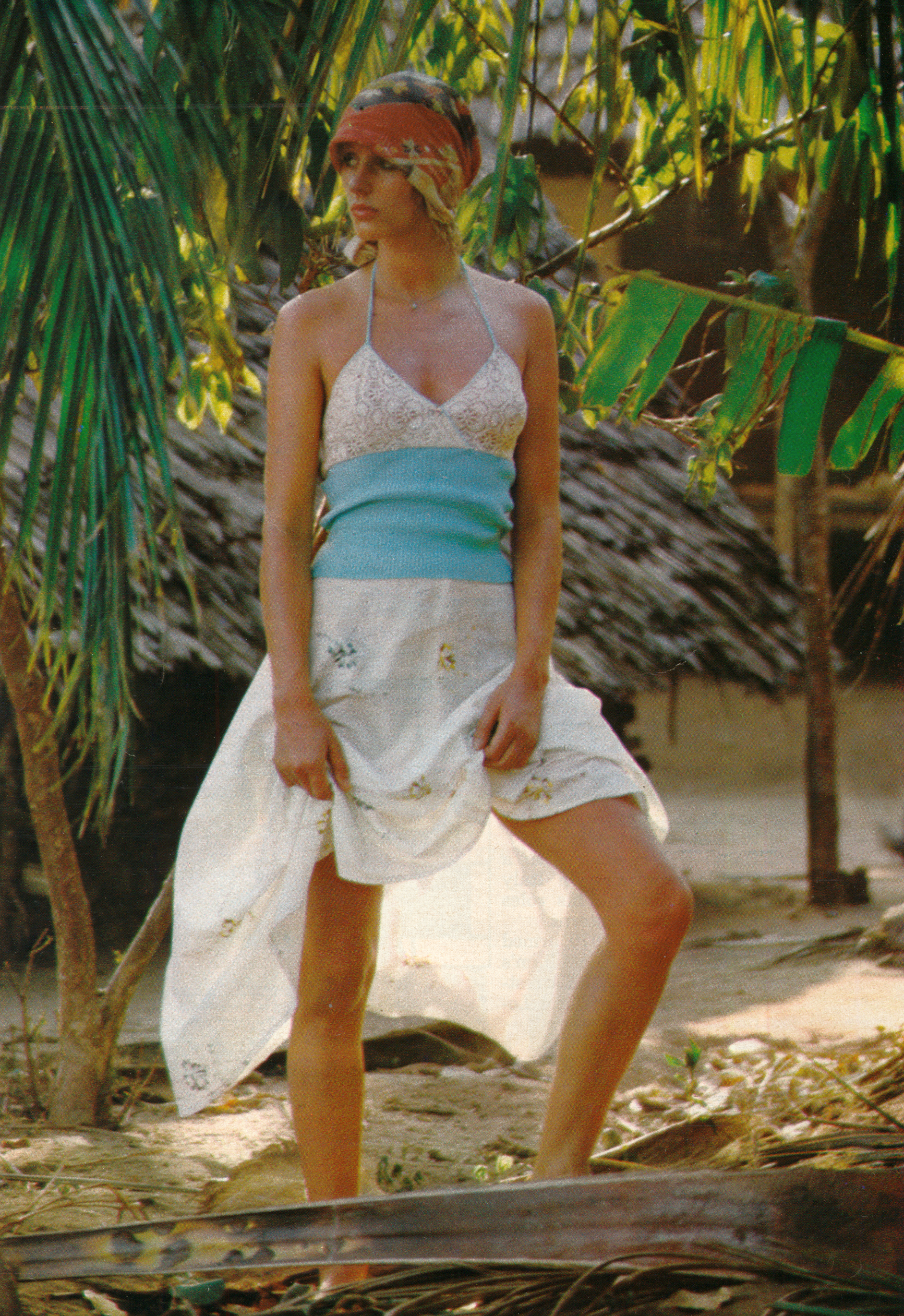 Navy denim hat, by Jean-Charles Brosseau from Feathers, £5.75 (£5 15s.). Red cotton jersey shirt, £5.95 (£5 19s.). Red, navy and white jersey vest with side button fastening, £2.50 (50s.). White bonded jersey blazer, £7. Navy jersey shorts, £3.75 (75s.). All by Lee Bender for Bus Stop. Navy socks, from Fenwicks, 50p. (10s.). White sandals with cork soles from Ravel, £4.50 (90s.).
