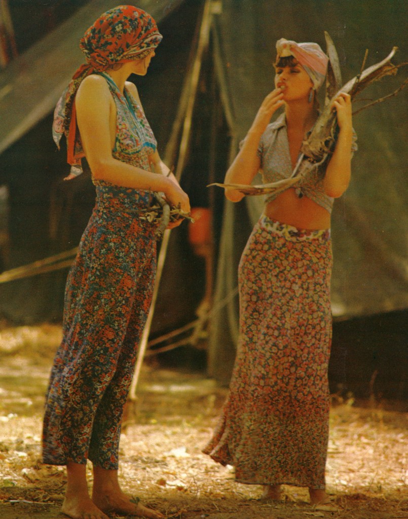 Cream is in favour with Marianne (left) looking great in culottes and baggy blouse. Right: Louise wears a cream skirt and blouson jacket. Seems to impress Queen roadies John and Paul, too.
