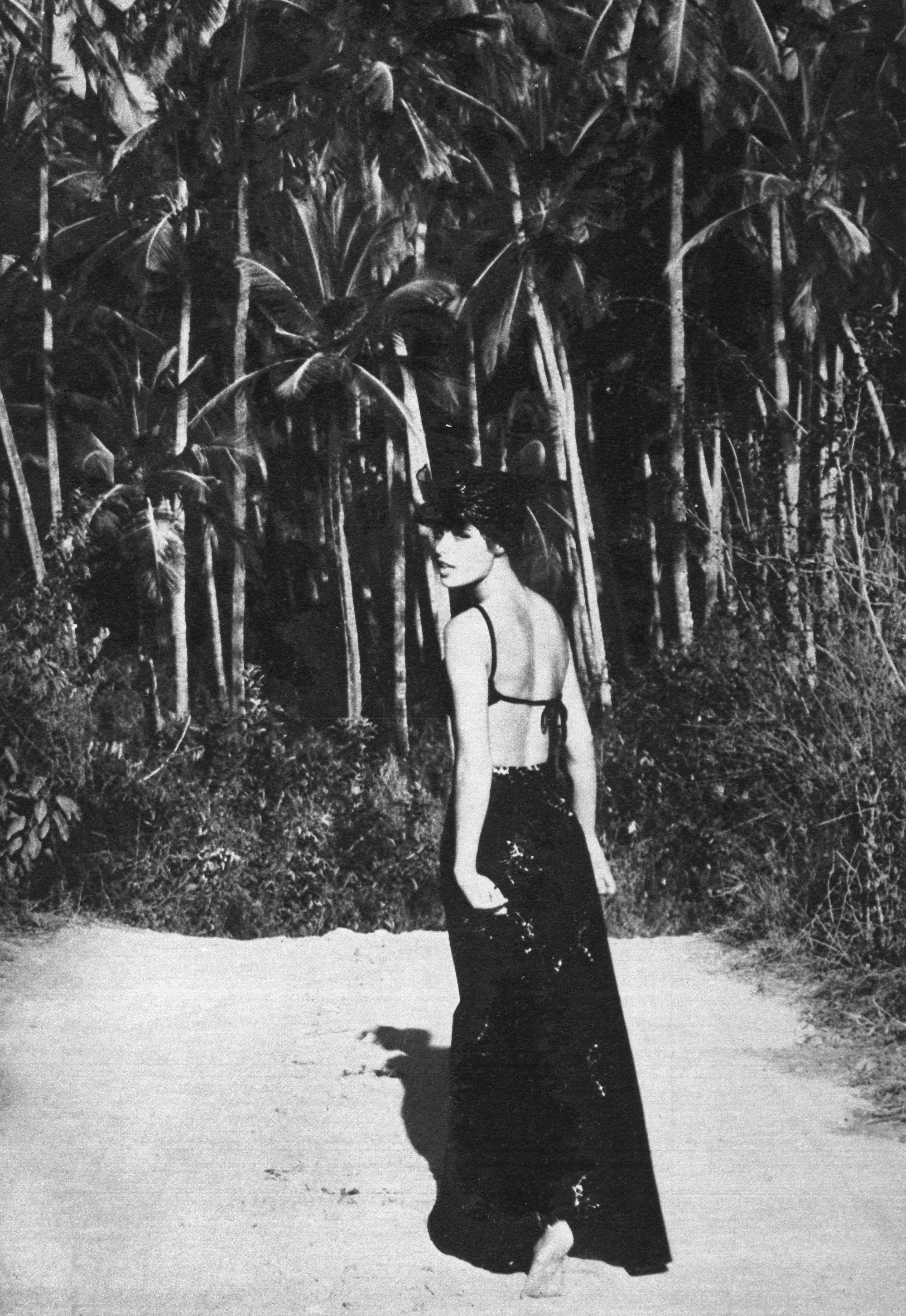 Black printed scarf from a selection at Essences. Black bra top by Erica Budd. Black cotton skirt with embroidered floral by Janice Wainwright.