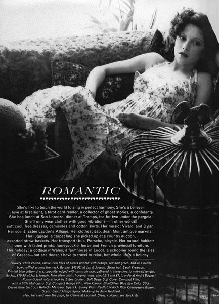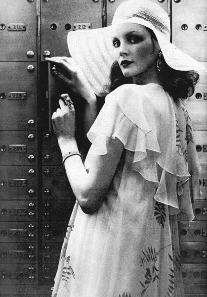 A natural actress, show-off and scene-stealer. She arrives hours late for almost everything and her entrances are timed to perfection. She spends money like there’s no tomorrow and she makes it too. A born gambler, she cashes in her diamond chips and plays the stock market with gilt-edged assurance. She’ll have nothing but the best, including men. Her music? Mahler and the sound of oil wells. Her habitat: Annabel’s, Ritz bar anywhere, Mark’s Club. Her holiday: Las Hadas, Mexico, El Cuarton, Spain, Bali, Brazil. Her luggage: Vuitton. Her clothes: as you see here. Her scent: the newest. She travels by Lear jet, Rolls Corniche convertible, horse and carriage. She reads the Financial Times and there’s nothing average about her Dow-Jones.