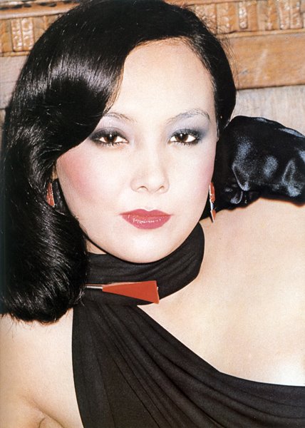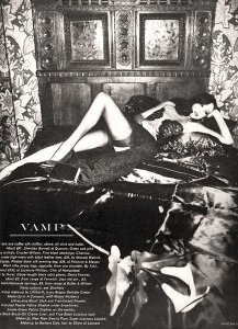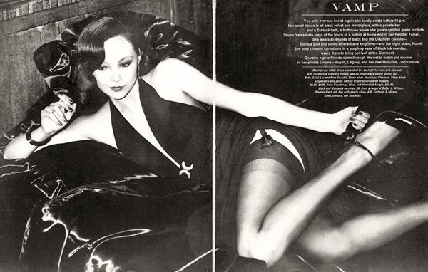 You only ever see her at night: she hardly exists before 10pm. Her small house is all black velvet and mirrorglass, with a private bar and a fishtank bath, a hothouse where she grows spotted green orchids. Stomo Yamashata plays at the touch of a button at home and in her Panther Ferrari. She wears all shades of black and the Diaghilev colours – fuschia pink and violet, emerald and kingfisher – and the night scent, Norell. She puts crimson carnations in a porphyry vase of black ink overday, wears them to bring her luck at the Clermont. On rainy nights friends come through the wet to watch old movies in her private cinema – Bogart, Cagney, and her new favourite, LinoVentura.