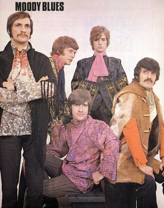 I can’t even begin to express how devastatingly sexy this photo is. Not necessarily because of their physical attractiveness (though I should point out that Justin Hayward is looking very pretty there at the back and Mike Pinder looks very manly and yum on the left) but because of how they’re dressed. Fringed shawls! Striped trousers! Gold braiding! Neckerchiefs! Paisley shirts! Moustaches! Men need to dress like this.