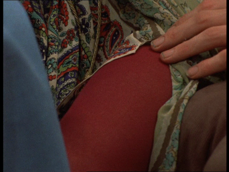 By this point, I started wondering if this wardrobe was perhaps that of the actress rather than of the character. Nina van Pallandt was a successful Danish singer (with husband Frederik van Pallandt, they were known as ‘Nina and Frederik’) and would have spent a great deal of time in London. It otherwise seemed a bit odd that she was wearing clearly British-made clothes, albeit in a style which wouldn’t seem too dramatically out of place in early 1970s California. It certainly sets her apart from the few other women in the film, including Marlowe’s doped up neighbours (who are rarely clothed at all), and gives her a dreamy, other-worldly quality.