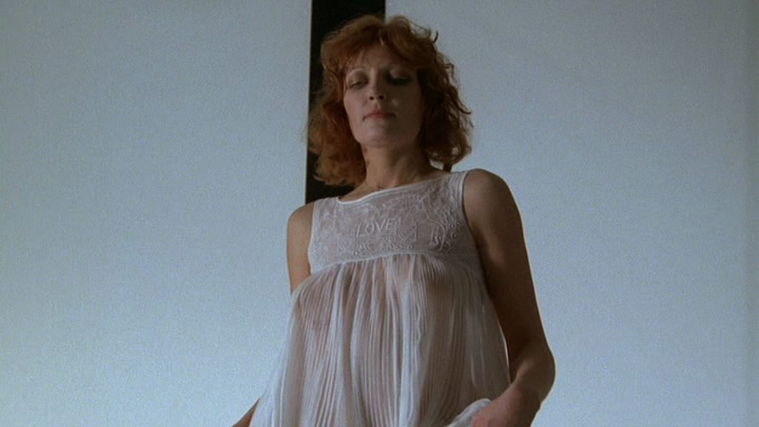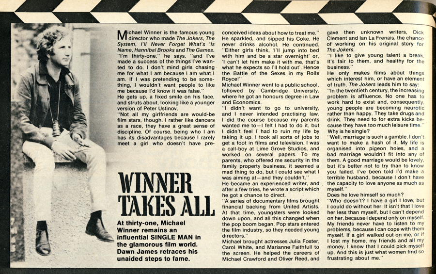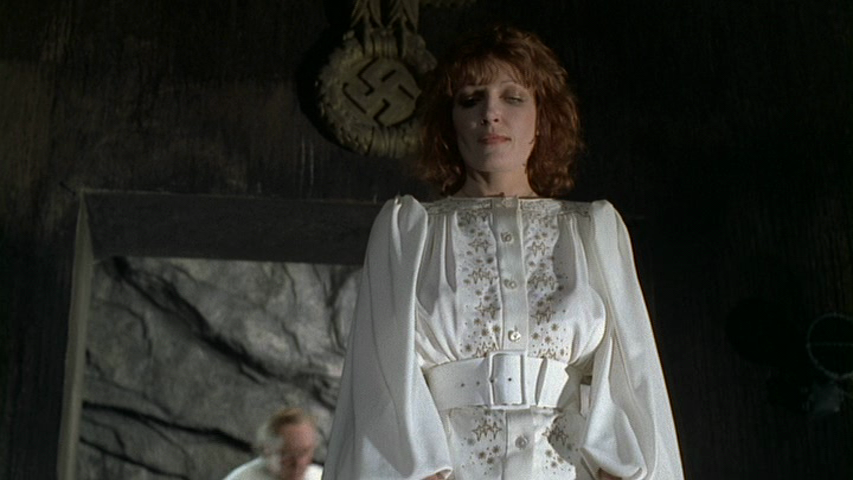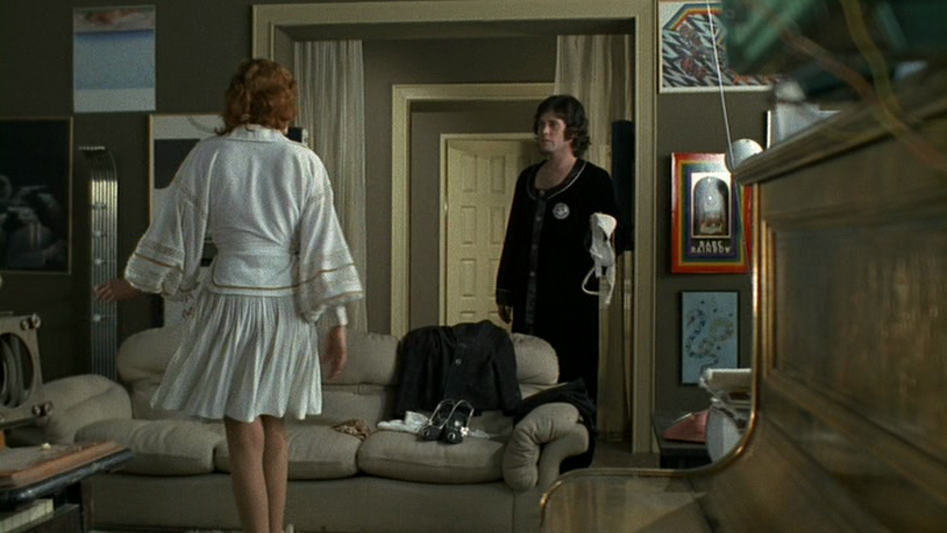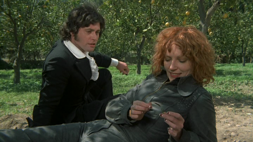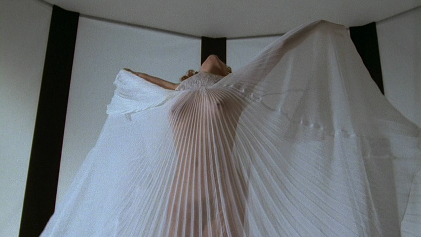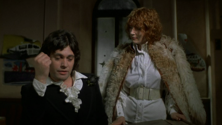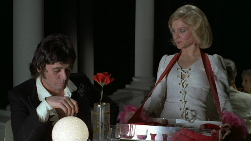 Jenny Runacre (below) is the lucky lady with the impossibly elegant (and predominantly white) couture John Bates wardrobe. Her ‘look’ is strikingly unusual for the time, and a perfect contrast to the brief appearance by Julie Ege (above), who is the perfect early Seventies dolly we see in a Mr Freedom, Pop Art-inspired sequence, and later to Sandra Dickinson’s kitschy, bottle blonde waitress. Runacre looks like a kind of hard bitch version of a Botticelli muse; big eyes and softly curled hair flat around her face, but with a gorgeously sneering voice and a cool air of superiority.