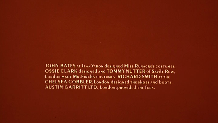 While there is no specific designer credited with the costumes of the more minor characters, the overall costume consultant – I was delighted to note – was one Marit Lieberson. Better known as Marit Allen (formerly of British Vogue and one of the most influential fashion journalists of the 1960s) Allen championed both John Bates and Ossie Clark early in their careers – wearing a design by the former for her wedding to Sandy Lieberson (also producer of this film) in 1966 – so the decision to use them so prominently in the film makes the most perfect sense.