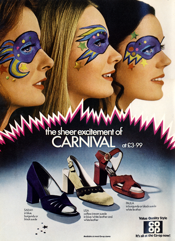 'Carnival' shoes advert from the Co-op. Scanned from Vogue, April 1972.