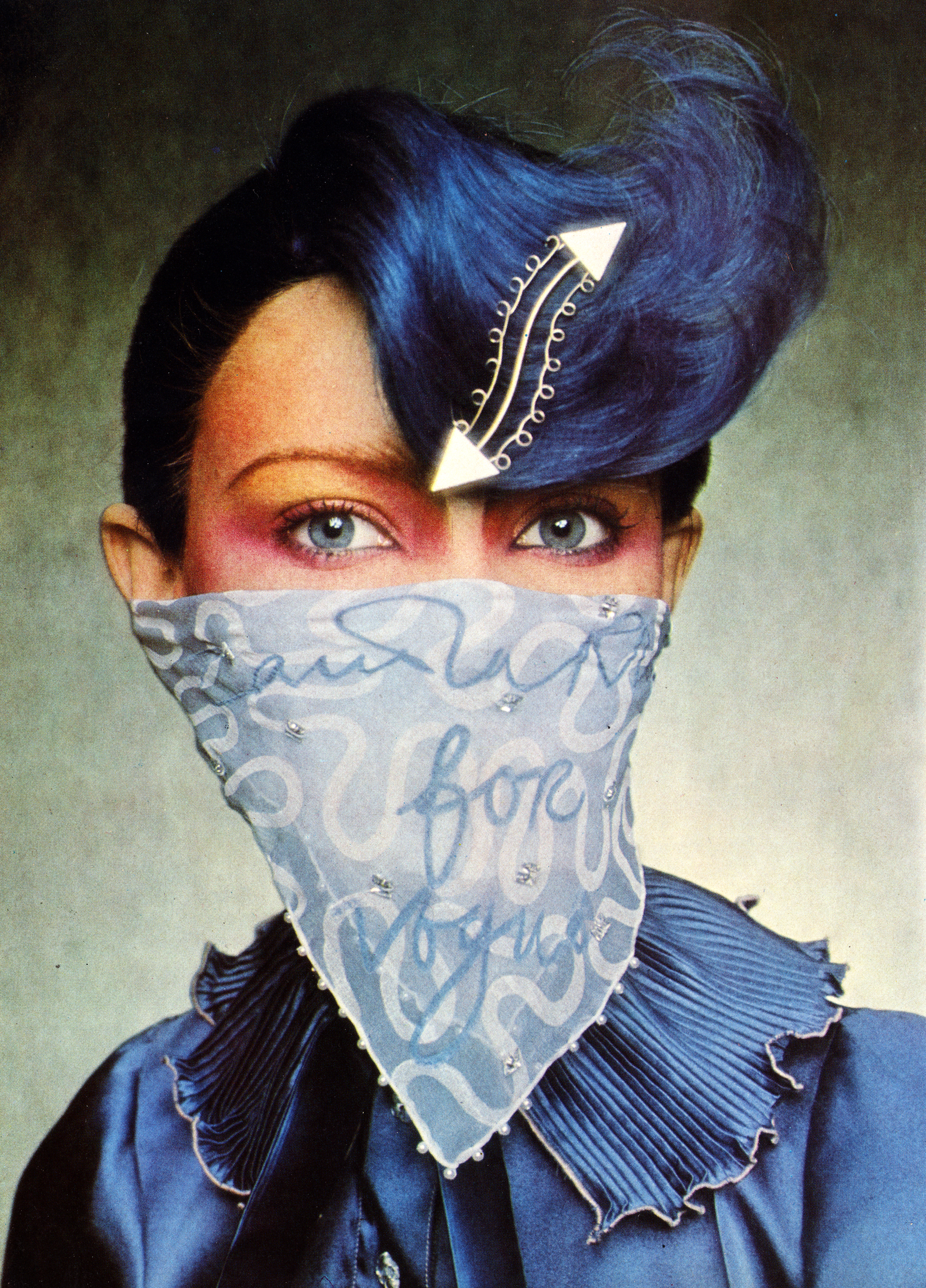 If it’s blue hair and pink eye make-up, it must be Zandra Rhodes. And if it’s a diamante studded chiffon kerchief, it must be Zandra’s Christmas present idea. Inscribed ‘Zandra Rhodes for X’, it costs from £12.50, witchball blue satin shirt, £40, at Zandra Rhodes. Blue quiff on a black wig coloured by Daniel, cut by John, at Leonard. Golden arrow pin by Mick Milligan for Zandra Rhodes. Make-up by Richard Sharah using Mary Quant.