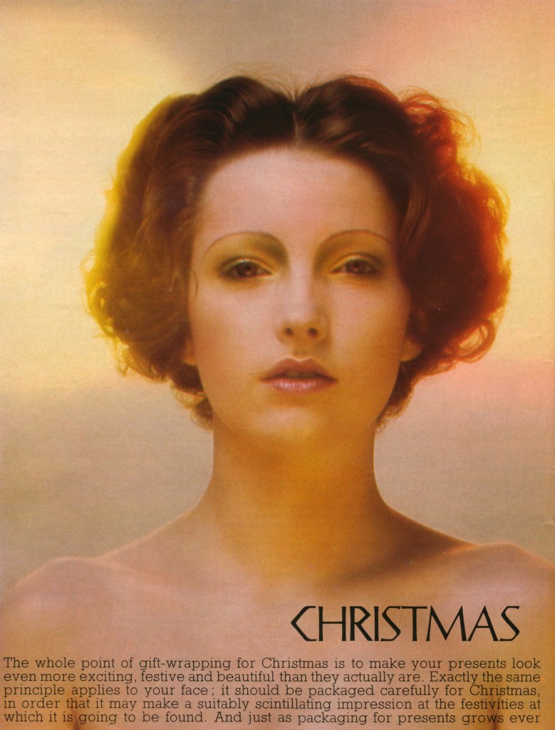 The whole point of gift-wrapping for Christmas is to make your presents look even more exciting, festive and beautiful than they actually are. Exactly the same principle applies to your face ; it should be packaged carefully for Christmas, in order that it may make a suitably scintillating impression at the festivities at which it is going to be found. And just as packaging for presents grows ever more ambitious year by year, so does it for faces ; no longer will a quick dollop of gold eyeshadow transform you into the belle of the ball. Your own personal Christmas packaging should be like the ones here, a dazzling combination of colour and shine…