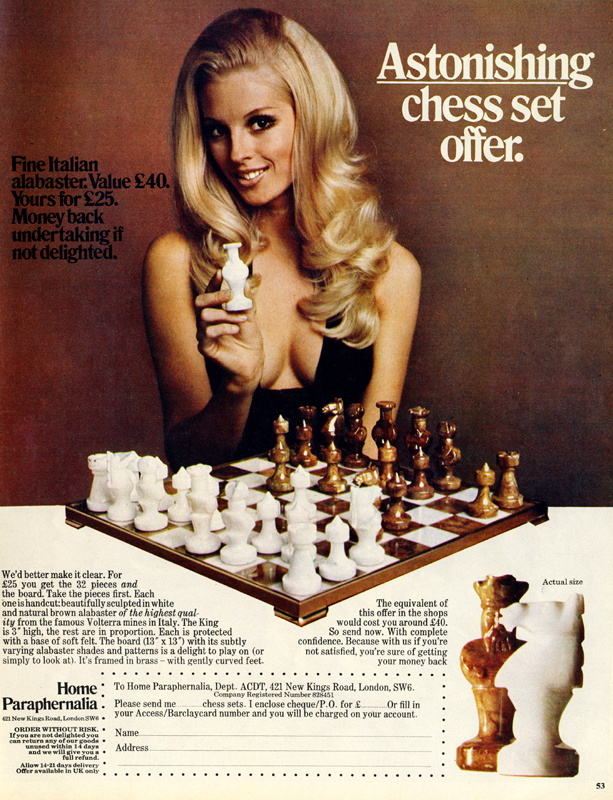 blakes 7, hair, haute naffness, interior design, servalan, seventies fashion, Vintage AdvertsThis advert pleases me on so many levels. Her hair, her décor, her artfully jumbled dressing table, the Russian doll, the giant die, the solitary stick of chewing gum….