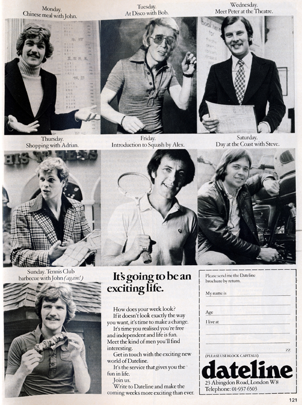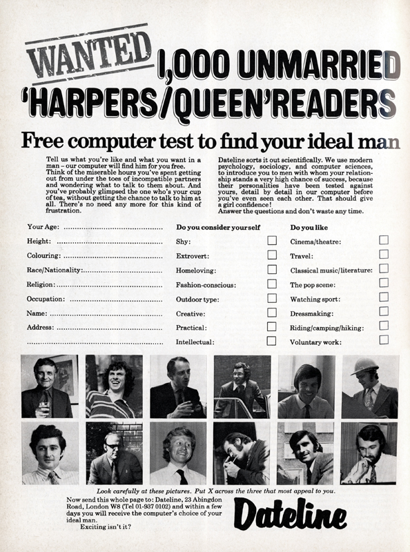In honour of the general weird horridness of Valentine’s Day when you’re a singleton, here are some superb dating adverts from Harpers and Queen and Cosmopolitan, 1972 and 1975 respectively. Personally, I would stay well away from Peter, theatre or no theatre, and I’d be a bit concerned for my safety down the disco with Bob.