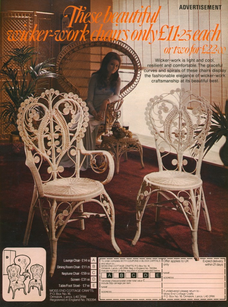 Advert for Moss End Cottage Crafts collection of Wicker-work furniture.