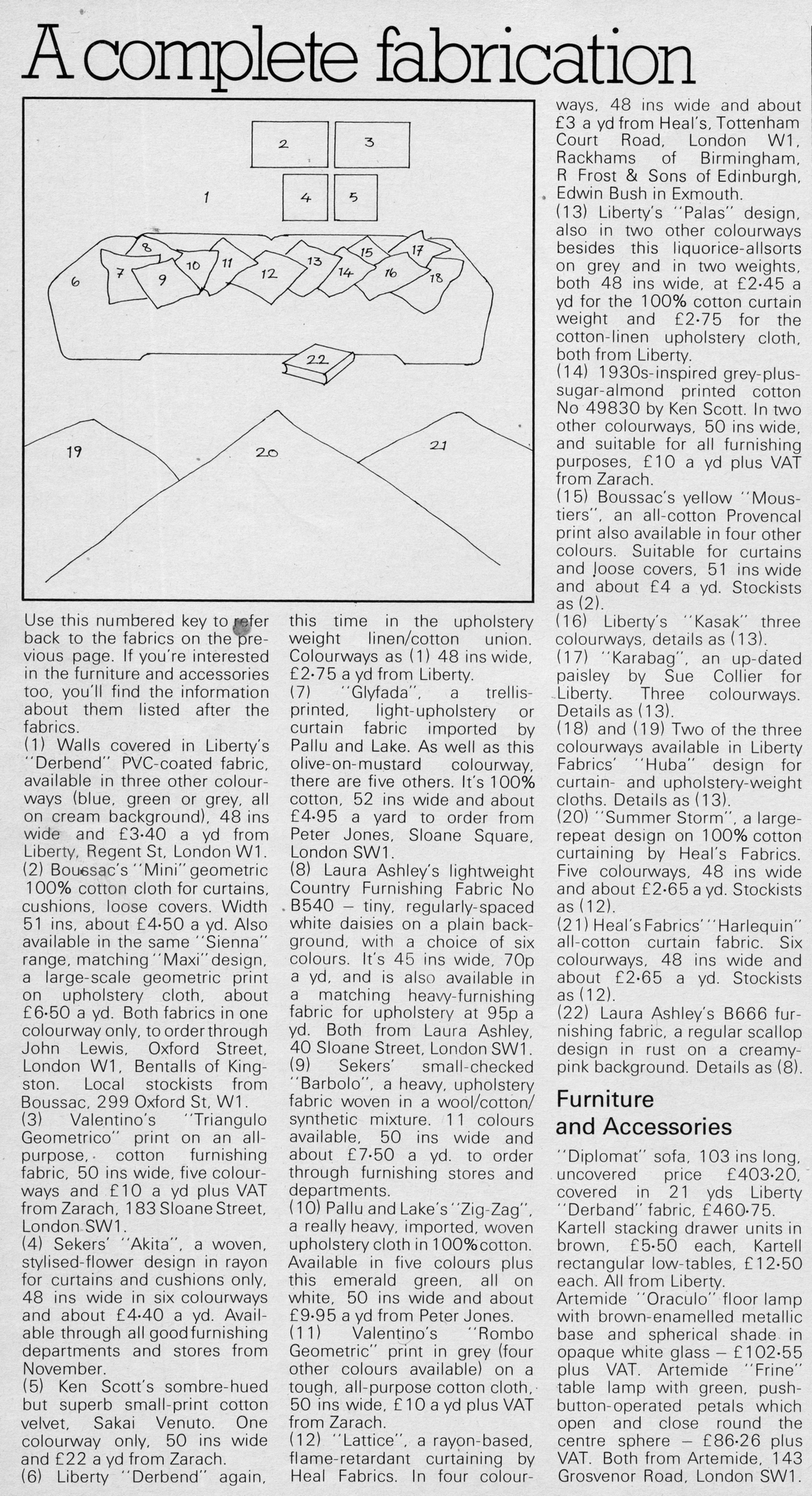 Photographer sadly uncredited. All fabric and furniture credits (Liberty’s, Heals, Ken Scott, Laura Ashley, Valentino, Pallu and Lake, Boussac, Sue Collier, Artemide, Sekers etc) using the key are in the image below.