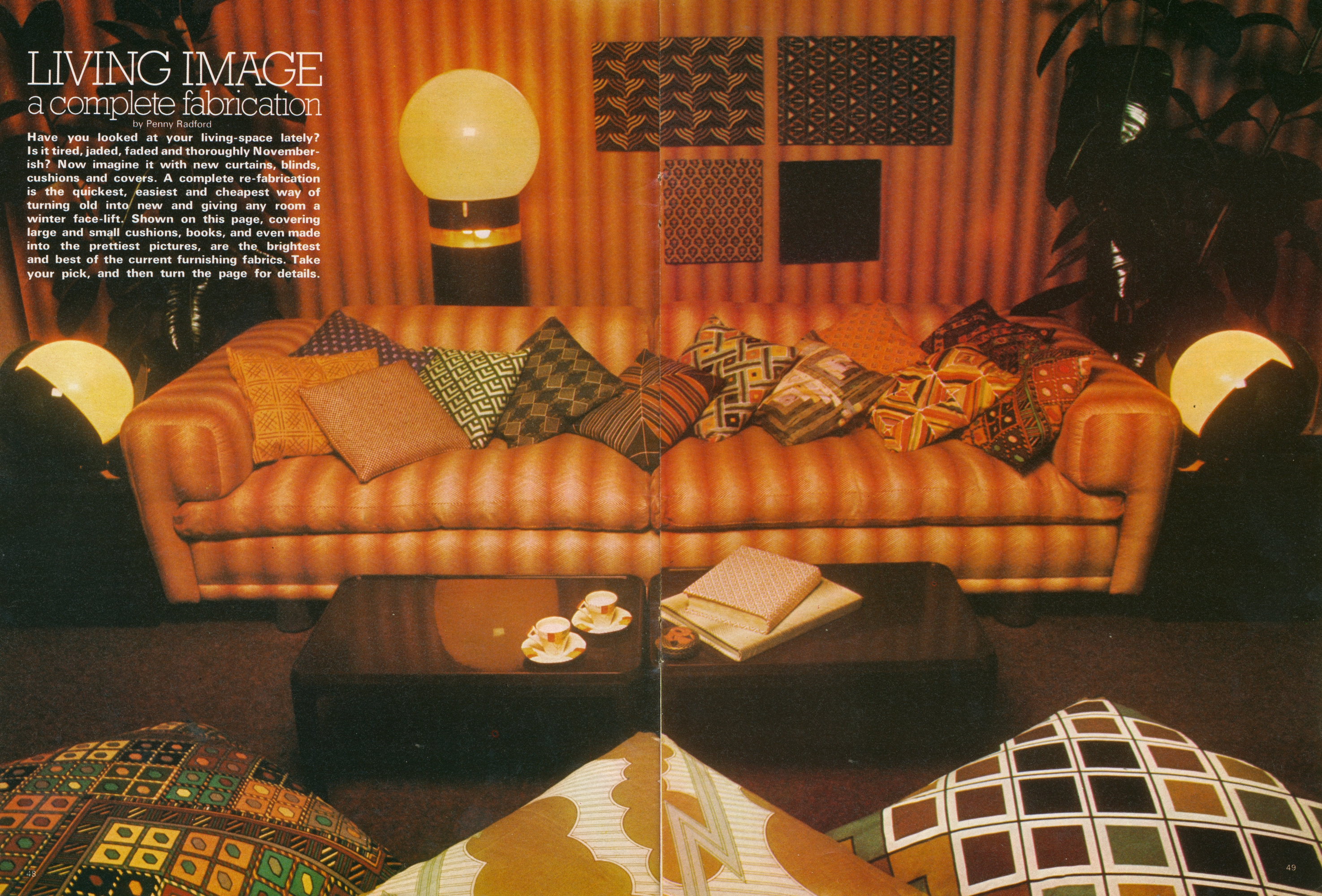 Trying to brighten up your living area with the minimum of cost is a difficult thing to do if it involves buying a cosy sofa or even buying new seat covers (have you noticed the prices lately?). The only way for a poor girl to cope is to think practical and get into the cottage industry kick with some nice fabric, a needle and thread. The simplest and most comfortable way to make a living-room really liveable in—i.e., to plonk around and relax in, as well as providing a soft space for an overnight guest to kip on to go into cushions in a big way.