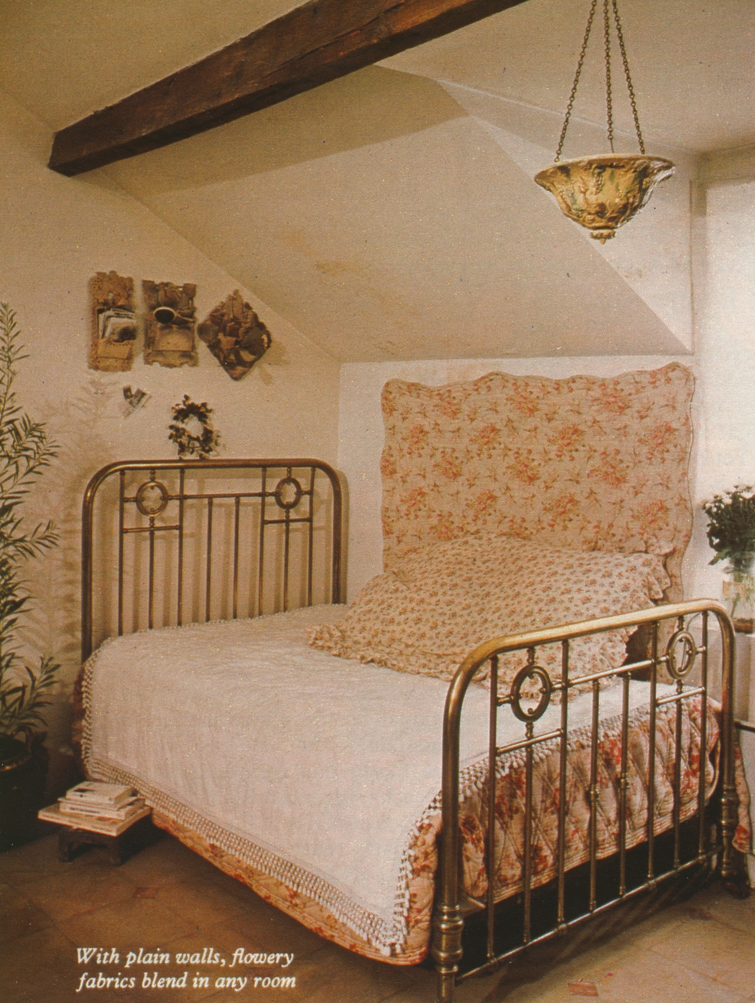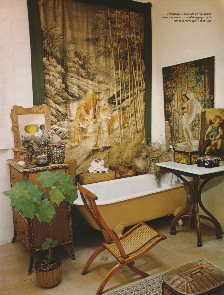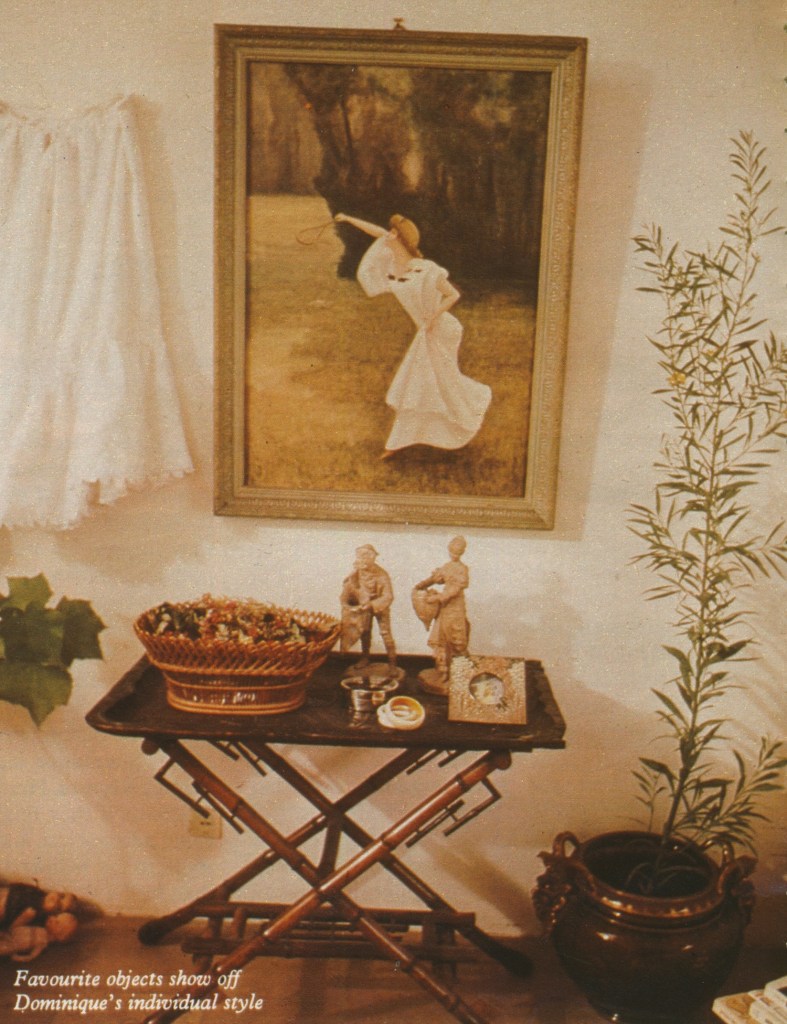 If you’ve spent longer in France than a weekend, you’ve probably noticed that most French girls have a greater sense of style by the time they are twenty than the rest of us will ever acquire. Instead of always trying to beat those clever ladies in the style stakes—and not quite succeeding — we should swallow our English pride and learn from them. Take Parisian Dominique Depalle, for instance, who has cunningly transformed a drab studio flat—the equivalent of a big-city bedsit or rented flat in a dingy Victorian house—into a warm, feminine home that looks as though it might have cost a fortune, but didn’t, thanks to Dominique’s experience as an antique dealer. She has a sharp eye for spotting bargains in junk. Dominique recently gave up her job in advertising to turn her hobby—collecting antiques—into a full-time occupation. Like Dominique, most girls in their late teens and twenties expect to swop flats, jobs, even cities, several times. Dominique decorates on the sensible principle that if she’s going to move on, she should be able to take all her favourite possessions with her when she goes. There’s not a fitted carpet, built-in cupboard or roll of wallpaper in the place. Dominique chooses every item with infinite care because she knows that each object will last a lifetime… like the Victorian bath, which could easily be transported with the help of a friendly lorry driver, and replumbed in another flat ; the huge tiger wall-hanging, not as practical as tiles, maybe, but then you can’t start taking down the tiles every time you have an altercation with your landlord. A bundle of small objects—baskets, ornaments and framed photographs—will pack easily into a suitcase. And by keeping walls plain wherever she goes, Dominique can be certain that her intricate wall-hangings, pictures and flowery bed-coverings will blend with every setting. Dominique dreams of eventually having a proper house—with a staircase, a loft and a cellar for apples and wine. Meanwhile she longs for adventure in her life and is thinking of going to live in Africa for a few years. If you, like Dominique, get itchy feet after more than a few months in the same place—but still want somewhere pretty to come home to —remember that your possessions should be as mobile as you are.