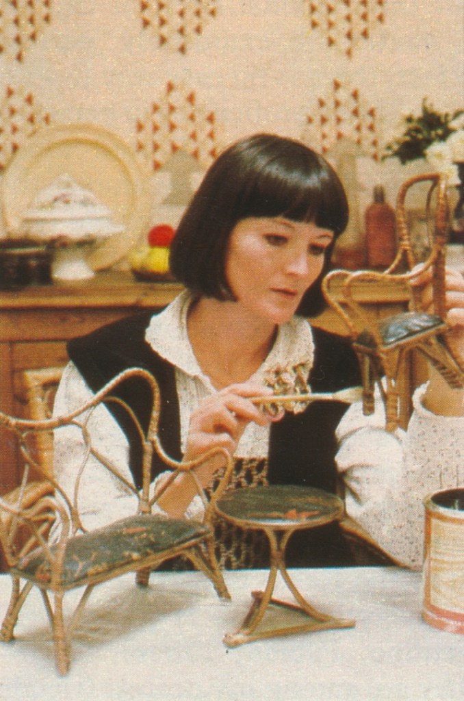 Dominique sells antiques at work and buys them for a hobby. Evenings at home are spent restoring her miniature replicas of old furniture