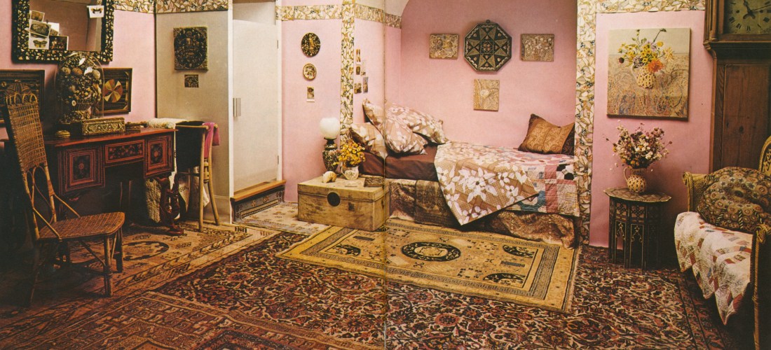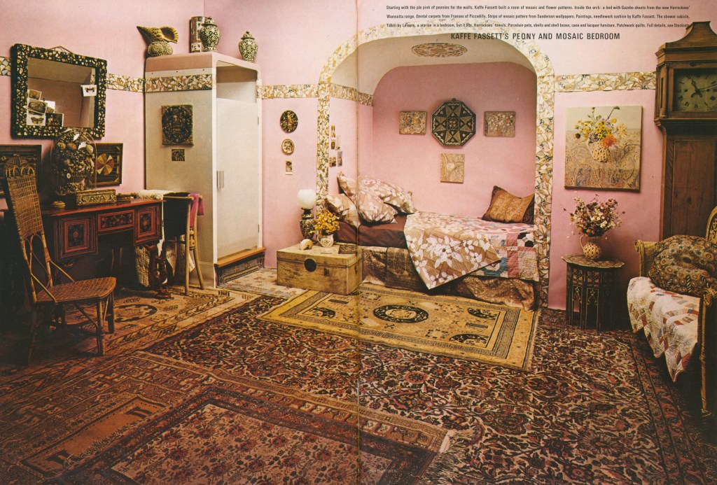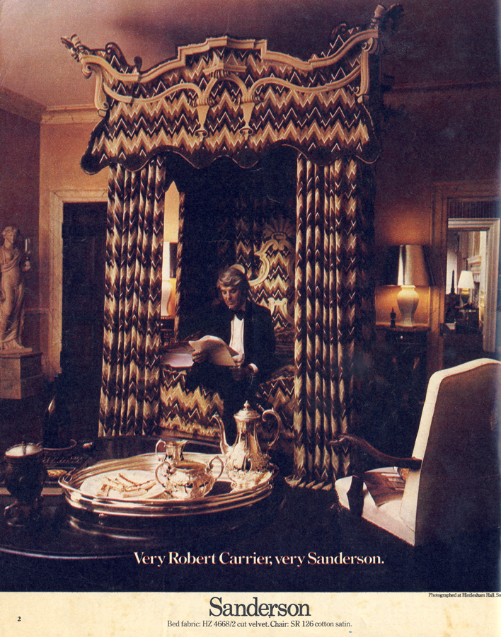 Oh I do love this series of Sanderson adverts, including Diana Rigg and Britt Ekland, and this four poster bed with its most extraordinary Biba-esque Art Deco inspired fabric is just a dream. I am not ashamed to say, I love spending time in bed; lolling around and generally keeping the real world well and truly out. And this would be the most perfect haven of a boudoir…