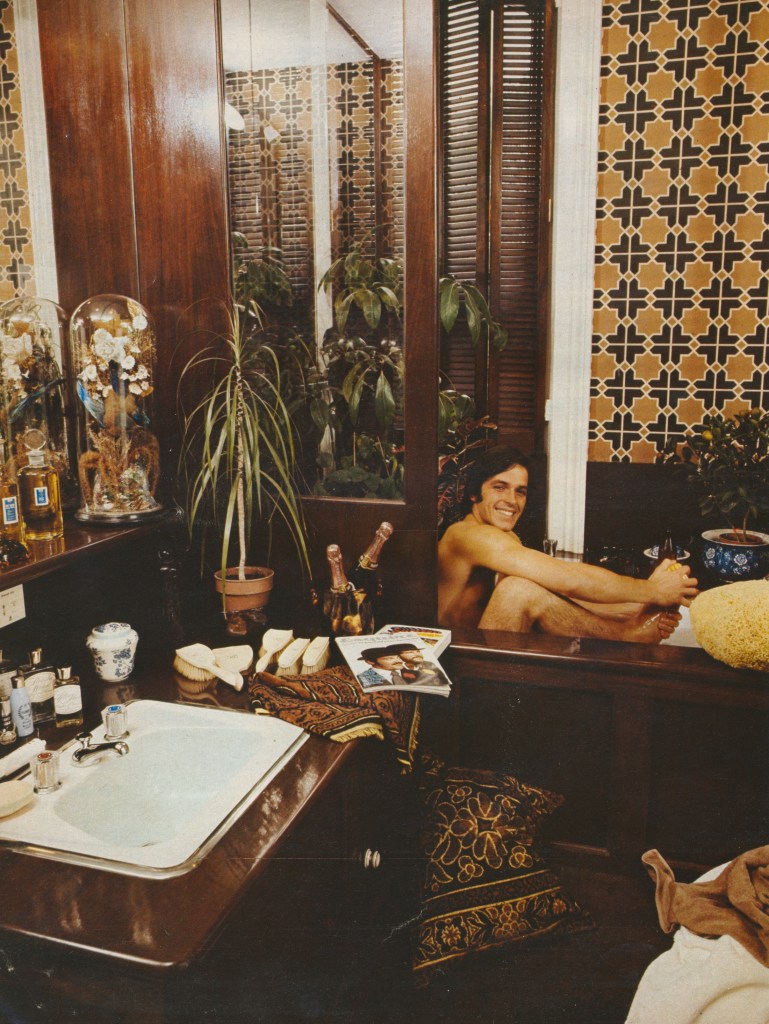 The lure of the East for international fashion designer, Thea Porter. She designed her Mayfair bathroom with a Moorish interior in mind . . . wide built-in seats with heavily embroidered cushions. a little arch cut into the wall to display treasured objects. Thea doubles her exciting room as a studio, hangs her paintings around the walls.