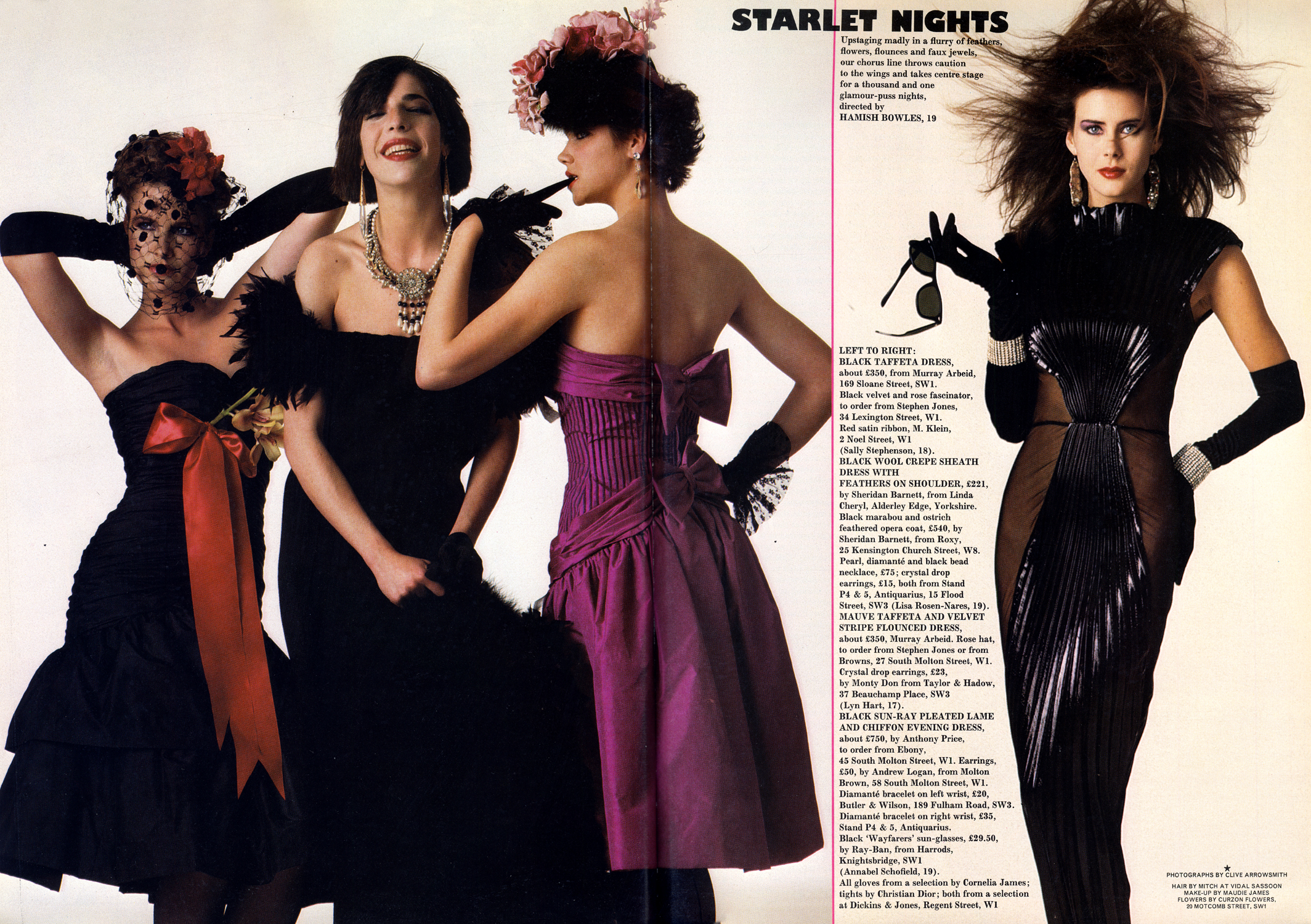 Left to right: Black taffeta dress by Murray Arbeid. Black velvet and rose fascinator by Stephen Jones. Black wool crepe sheath dress with feathers by Sheridan Barnett. Black marabou and ostrich feathered opera coat by Sheridan Barnett, from Roxy 25 Kensington Church Street. Mauve taffeta and velvet stripe dress by Murray Arbeid. Rose hat by Stephen Jones. Crystal drop earrings by Monty Don. Black sun-ray pleated lame and chiffon evening dress by Antony Price, to order from Ebony. Earrings by Andrew Logan.