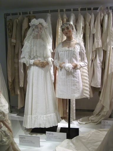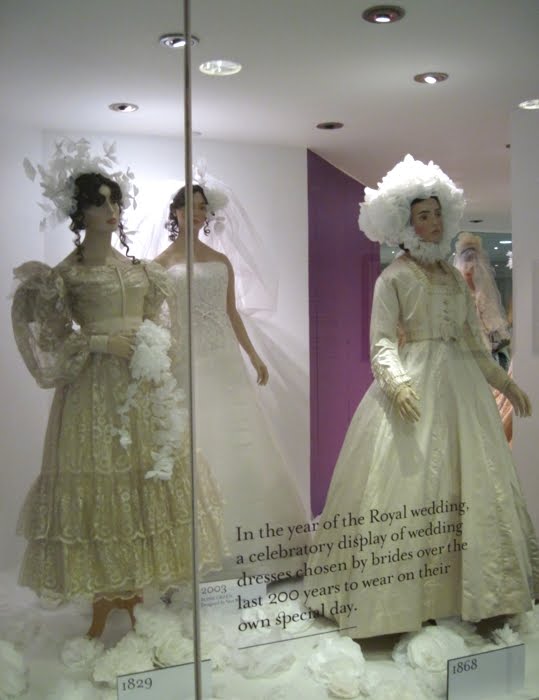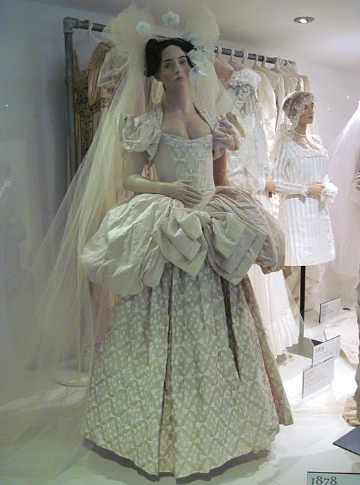 It was actually quite refreshing to take a look at The Fashion Museum’s current exhibition, What Will She Wear, which, despite the slightly cheesy Royal undertones in the title, is a wonderfully curated exhibition of Bath’s collection of wedding dresses down the years. As the ever lovely Iain R. Webb explained to me, they weren’t trying to create any kind of timeline or demonstrate particularly defining styles of any era. In fact, the pieces are grouped together in themes: silhouettes, fabrics, types of decorations. It’s certainly fascinating to see a Gina Fratini wedding dress alongside the Victorian styles which influenced her. Or a Bruce Oldfield facing a Victor Stiebel, both slimline and simple in silhouette, but a good sixty years apart.