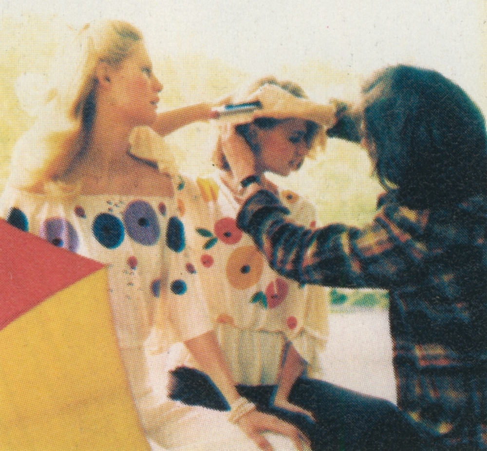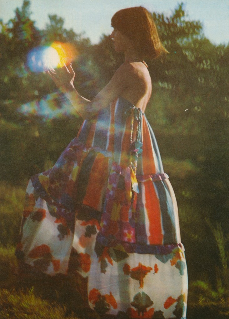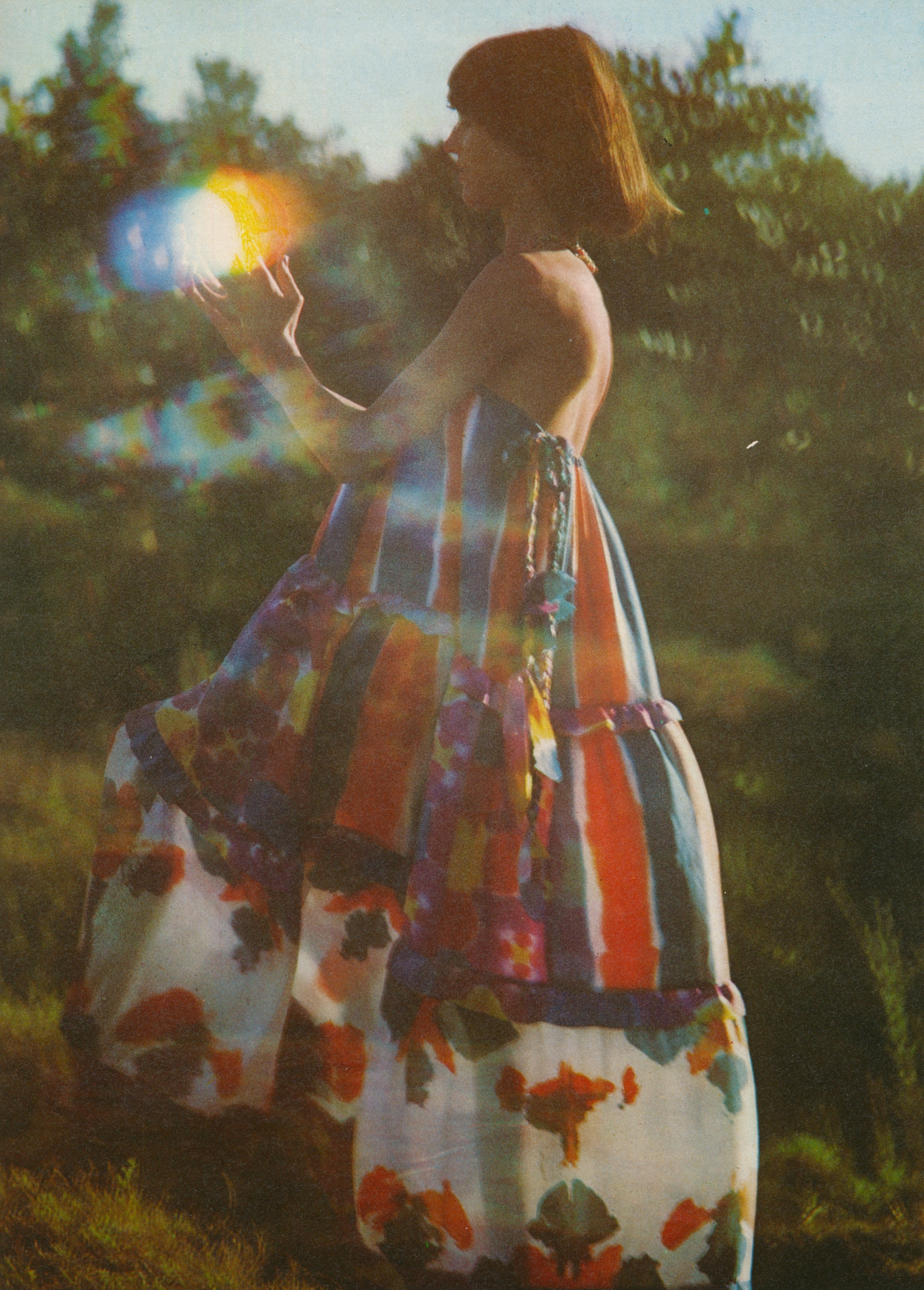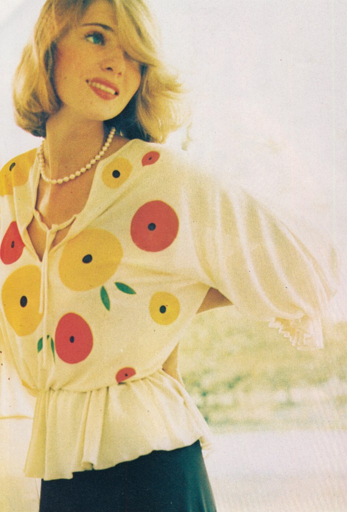 Simple cheesecloth, cleverly coloured blue and mauve for drawstring blouse (£5.50) and dirndl skirt (£9) both by French Connection at Cane, 170 Walton Street, SW3. Woven cotton waistcoat by Corine Bricaire (£12) at Browns, 27 South Molton Street, W1. Wraparound top on the right (around £2.95) by Global Editions at all branches of Fifth Avenue. Skirt (£8.50) by French Connection. Necklace (30p) from Miss Selfridge, Duke Street, W1.
