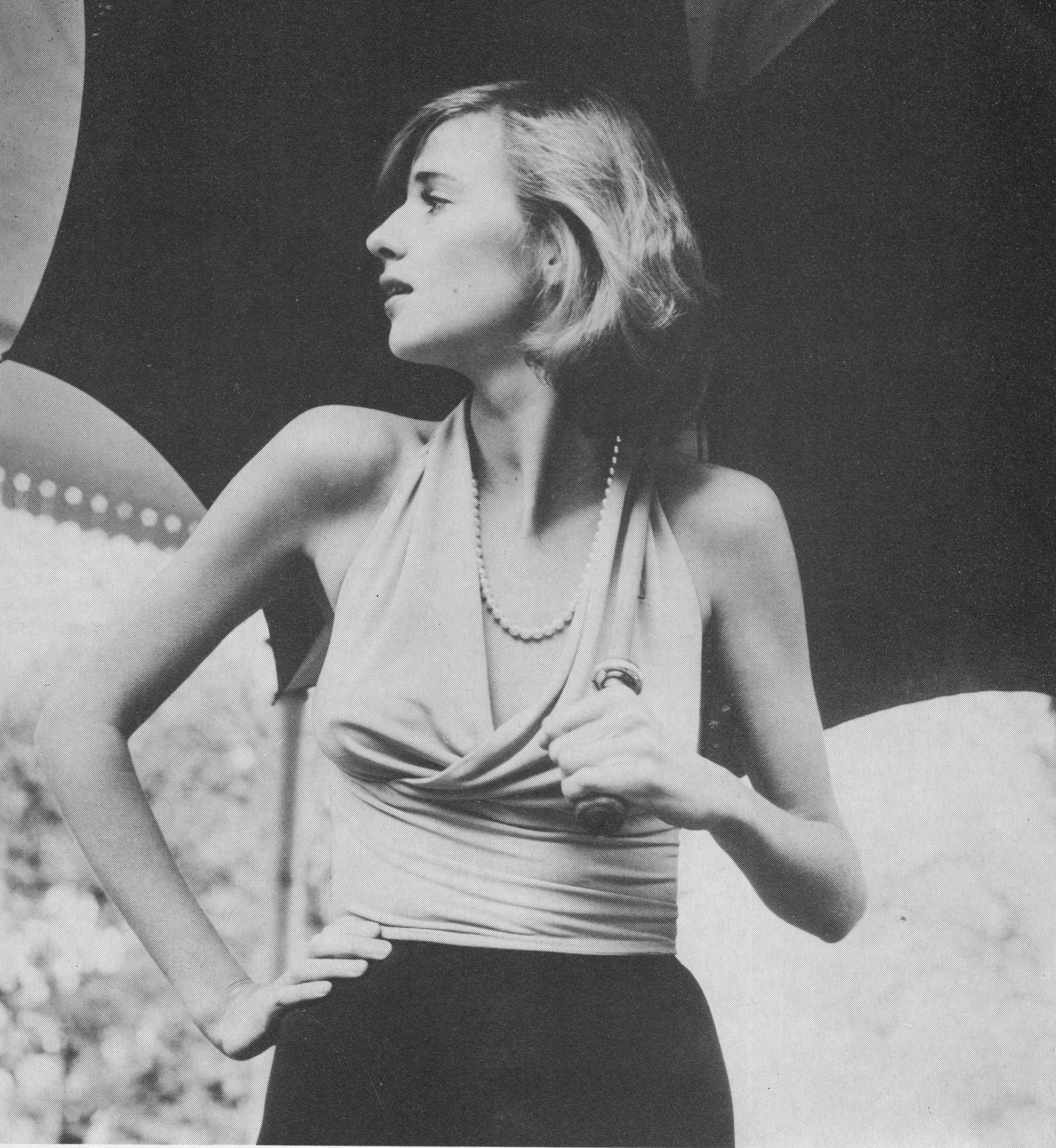 Jane Cattlin deserves them for making a whole clutch of wantable tops in clinging, sexy rayon jersey you wear with pants, long skirts, short skirts and under sober office suits for a straight-on-to-a-rave-up date. Simpsons of Piccadilly have taken the whole beautiful range shown above.