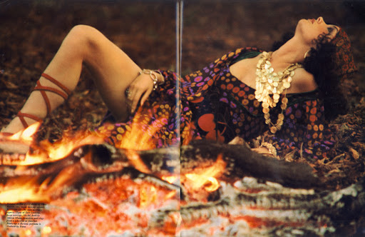 Above: Tobacco chiffon caftan with smoked gold leaves, hooded, boot-buttoned, Arabic sleeves weighted with tassels. Gathered from the waist with a twisted gold rope belt. Choker, The Purple Shop, 15 Flood St, S.W.3. Soft gold boots with open lacing, 22 gns, Kurt Geiger. Right: Black organza with a bib and skirt of brilliant panne velvet, red, green and yellow printed in ribbon bands, with bangles and cuffs of the velvet. Rings, Andrew Grima. Beaded black velvet choker, The Purple Shop. Black satin ankleboots, with bright passementerie, by Moya Bowler for Edouard Jerrold. Dresses, both pages, to order at Bellville Sassoon.