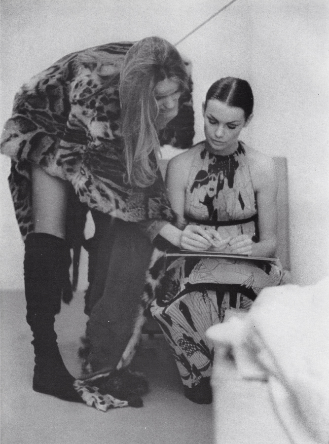 Misty blue tapestry and gold leaves. left. edged with wide ribbons of sprigged tapestry. A gold thread laces the deep neck of a small jacket belling from the Yoke, with short arabesque sleeves. Fade-print chemise underneath, with full sleeves and crossed braid ; a slim bell for a skirt. By Bill Gibb for Baccarat, at Fortnum & Mason. Pearly black velvet choker, The Purple Shop at Antiquarius. Tangerine braid decorations, from Savita. Rings, Andrew Grima. Honey-gold and gilt velvet slippers, 20 gns, to order, The Chelsea Cobbler. Make-up by Eve of Roma, with the new Eve scent.