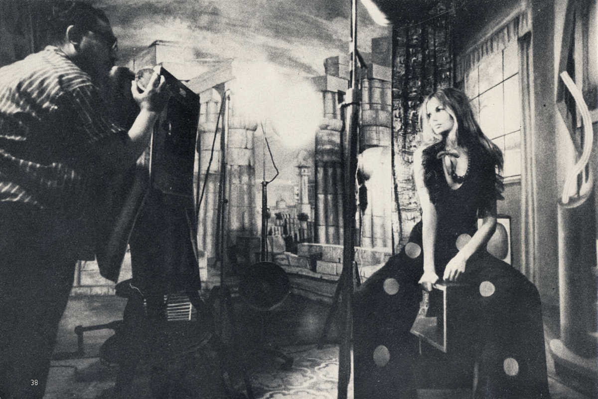 Black chiffon blouse and skirt tiled with cut velvet mosaic. Blouse of velvet harlequins, bibbed with jet beads set in little studs of gilt; the skirt, striped with studded circles and squares. £184, at Thea Porter. Feather fan, to hire at The Purple Shop. Satin shoes, dyed to order, £18, dyeing, 21s, Charles Jourdan.