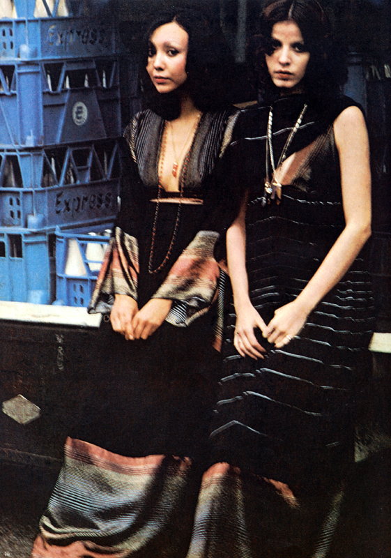 Centre, copper satin coat covered with navy and white cotton discs filled with butterflies, zipped up side, round the armhole to the collar and down the other side. Right, sashiko with a plaid of coloured lines, a violent satin hara kiri committed on the back (switched round here), £75. Black patent boots with turquoise satin platforms, £28. Wooden comb in the hair.