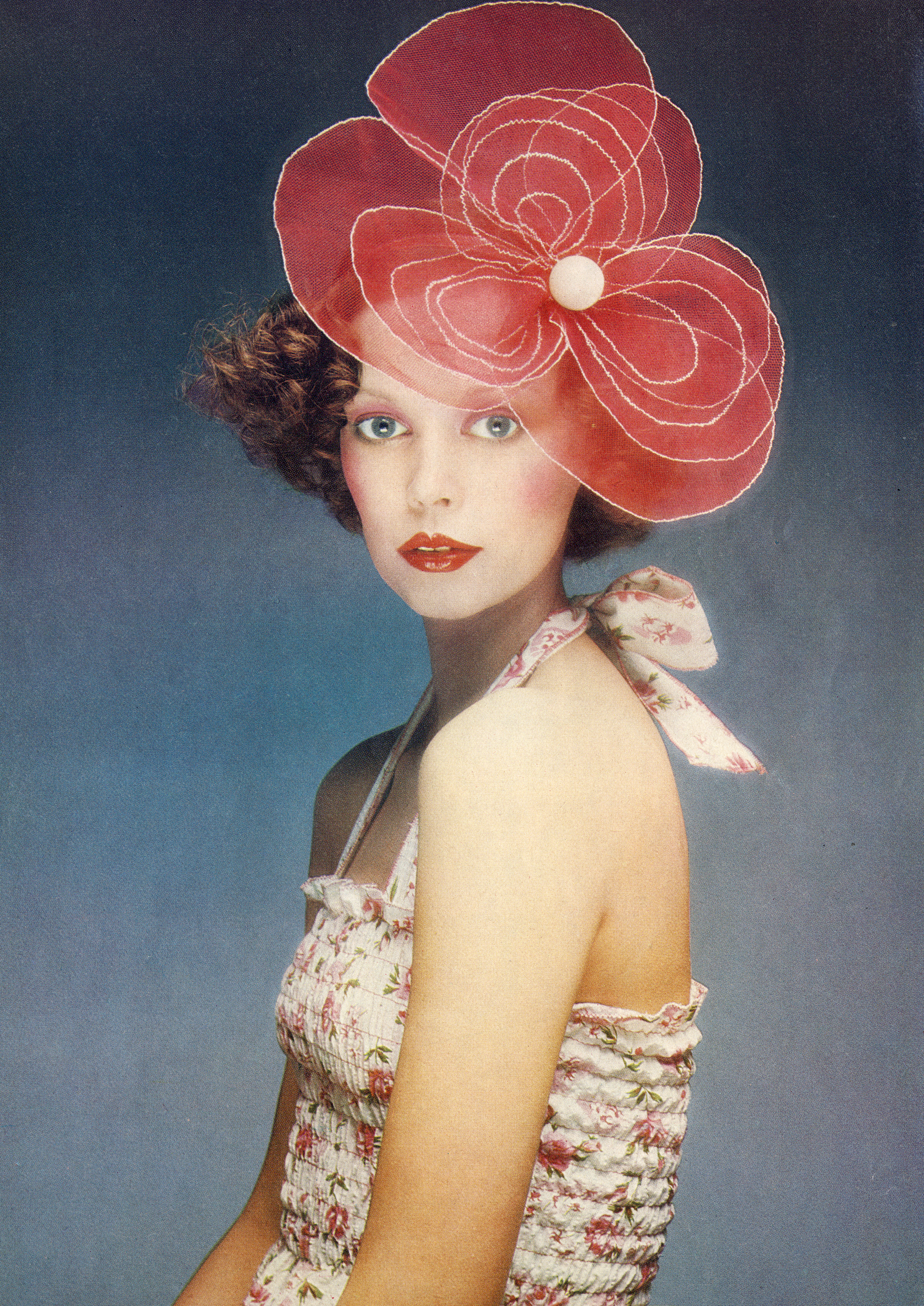 Caviar and Champagne dresses: Hats from J. C. Brosseau from Feathers. Veiling from Biba. Dresses by Tony Berkeley. Beige shoes found by our model in a junk shop.