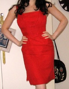 Slippery satin dress with palm tree printed bodice by Ossie Clark for Radley. Scarlet leather peep toe shoes by Zapata.