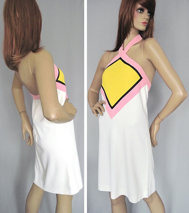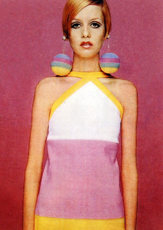 Daring slash necked lemon and lime striped Dicel crêpe dress with paste brooch by Linda Warren at Boobs. Suede plaited shoes by Bata. Tights by Mary Quant.